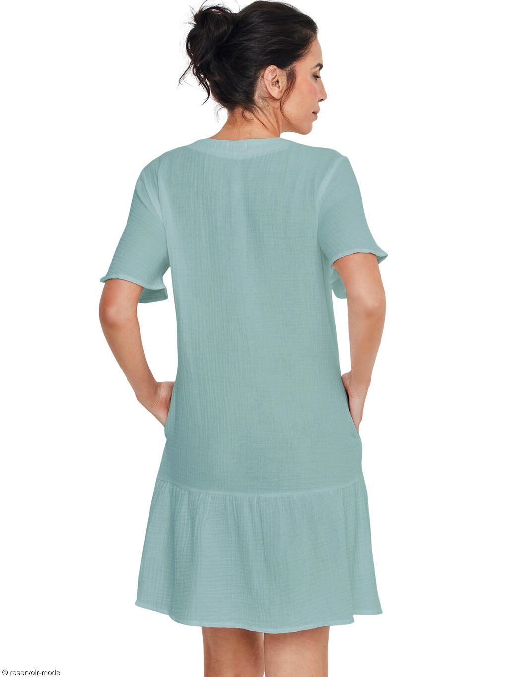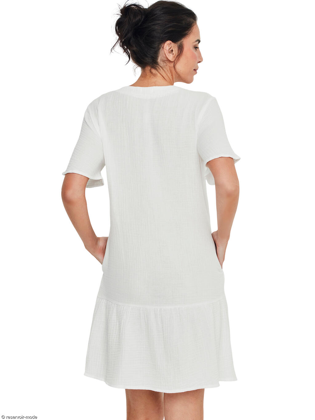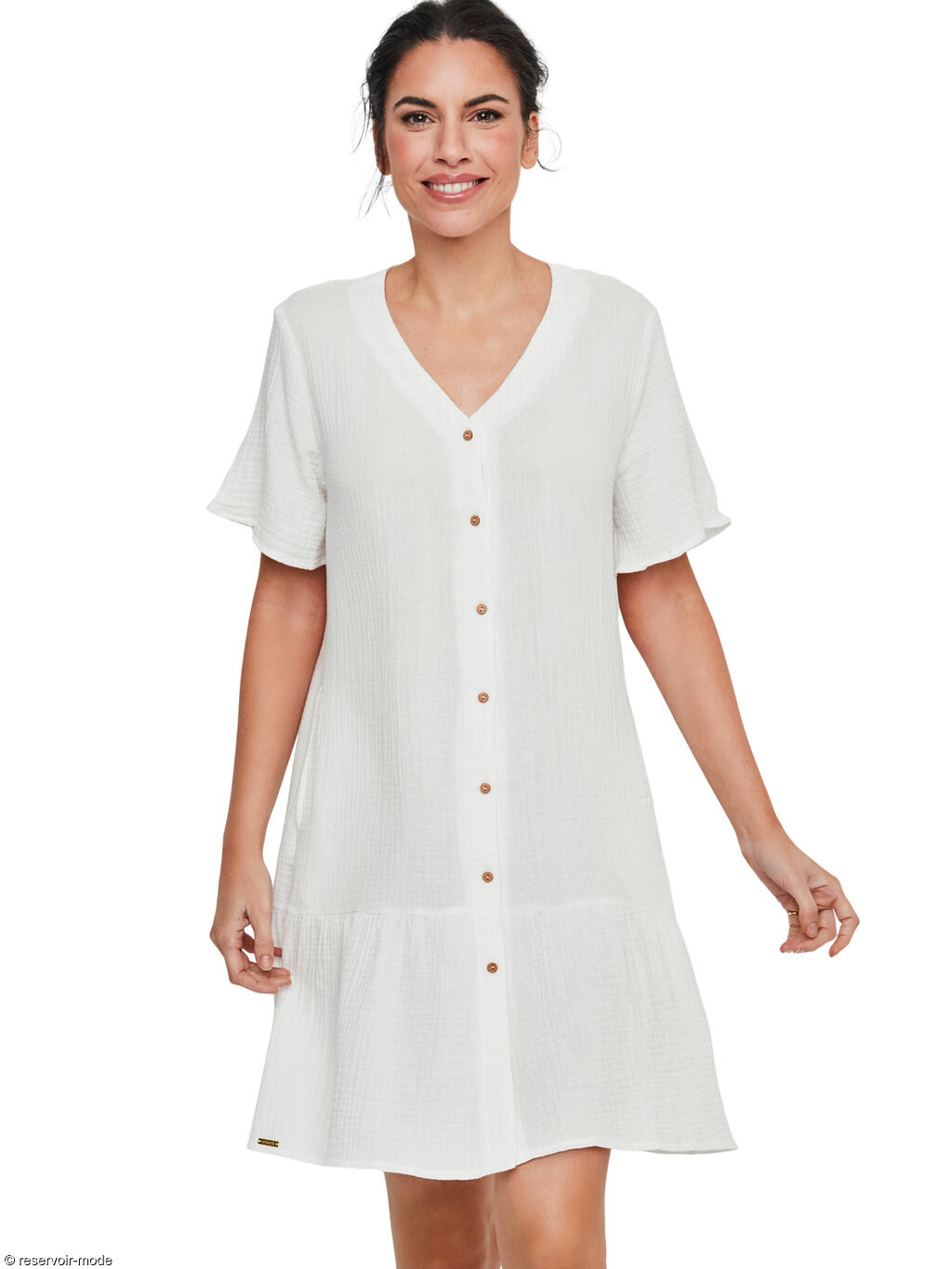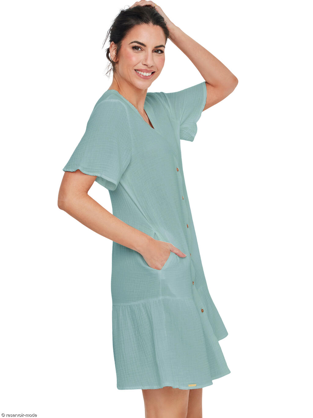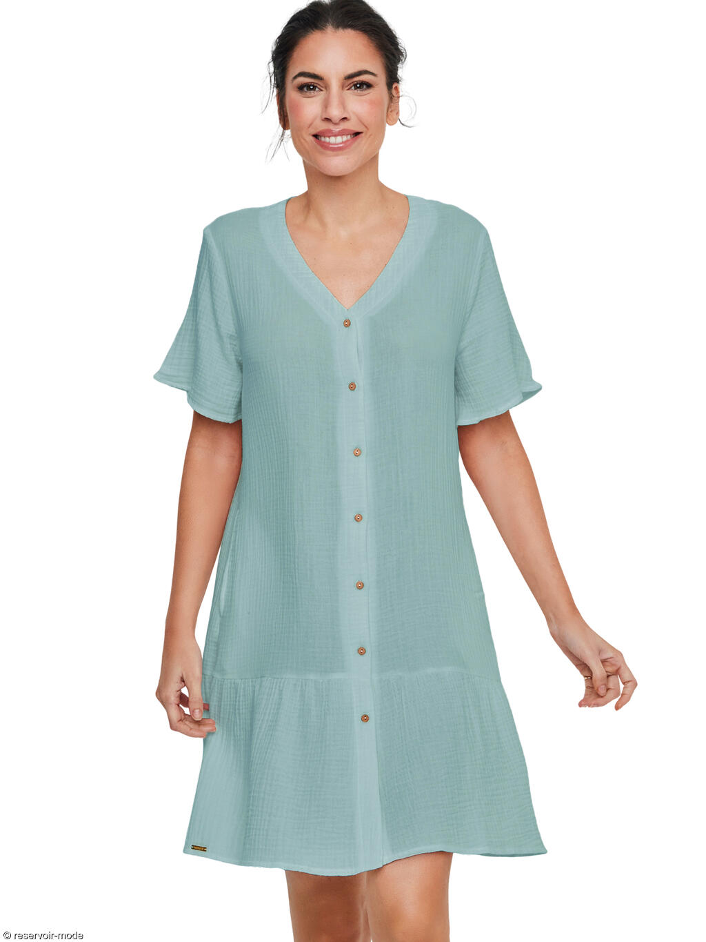 Cette chemise de nuit se distingue par une élégance naturelle et une sensation de fraîcheur incomparable, idéale pour des nuits tout en douceur. Réalisée entièrement en coton léger et respirant, elle offre un contact agréable et aérien sur la peau, parfait pour favoriser le confort tout au long de la nuit. La matière présente un aspect subtilement texturé, qui apporte du relief et une touche authentique au vêtement, tout en renforçant son charme naturel. Sa coupe droite et fluide tombe délicatement le long du corps sans le contraindre, assurant une grande liberté de mouvement. L’encolure en V, féminine et dégagée, est soulignée par une patte de boutonnage centrale ornée de petits boutons effet bois, qui ajoutent une note chaleureuse et raffinée. Les manches courtes légèrement évasées accentuent la légèreté de la silhouette, tandis que la longueur au-dessus du genou, complétée par un volant discret en bas, apporte une touche de douceur et de féminité. Sa teinte lumineuse évoque la simplicité et le bien-être. C’est une pièce intemporelle, à l’esthétique sobre et délicate, pensée pour celles qui recherchent un confort absolu allié à une élégance naturelle et apaisante.