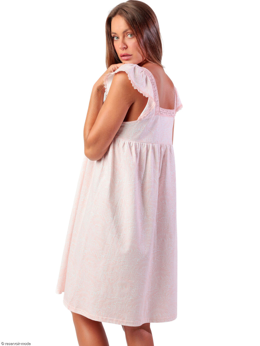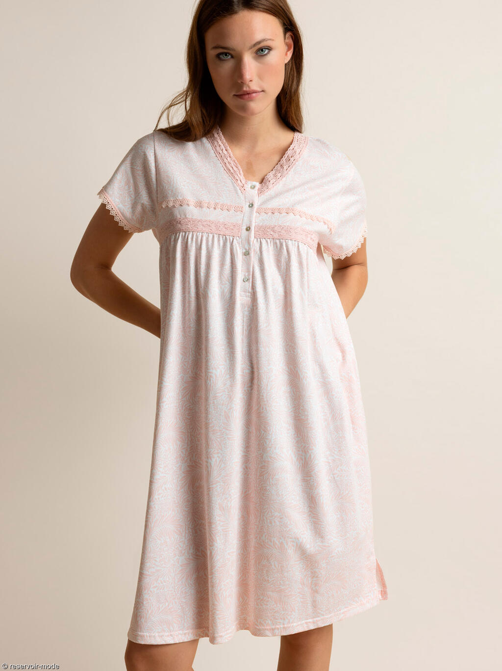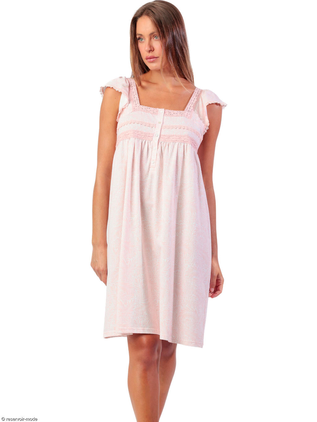 Cette chemise de nuit est un modèle féminin et délicat, à la coupe fluide et confortable. Son encolure carrée est soulignée de dentelle fine rose pâle, apportant une touche romantique. Une patte de boutonnage sur le devant, ornée de petits boutons nacrés, permet de personnaliser le décolleté. Elle la rend aussi pratique pour l'allaitement. Empiècement sous la poitrine, décoré de bandes de dentelle horizontales pour structurer légèrement la silhouette. De petites manches à volants, légères et froncées, qui ajoutent une note douce et raffinée. Le tissu arbore un motif discret à feuilles, dans des tons roses très pâles sur fond clair, donnant un effet doux et féminin. La longueur au genou et la coupe ample garantissent un grand confort, idéal pour la nuit. Cette chemise de nuit évoque un style romantique, frais et confortable, parfait pour une allure élégante même au repos. Livrée dans une boîte-coffret collection Classic Admas.