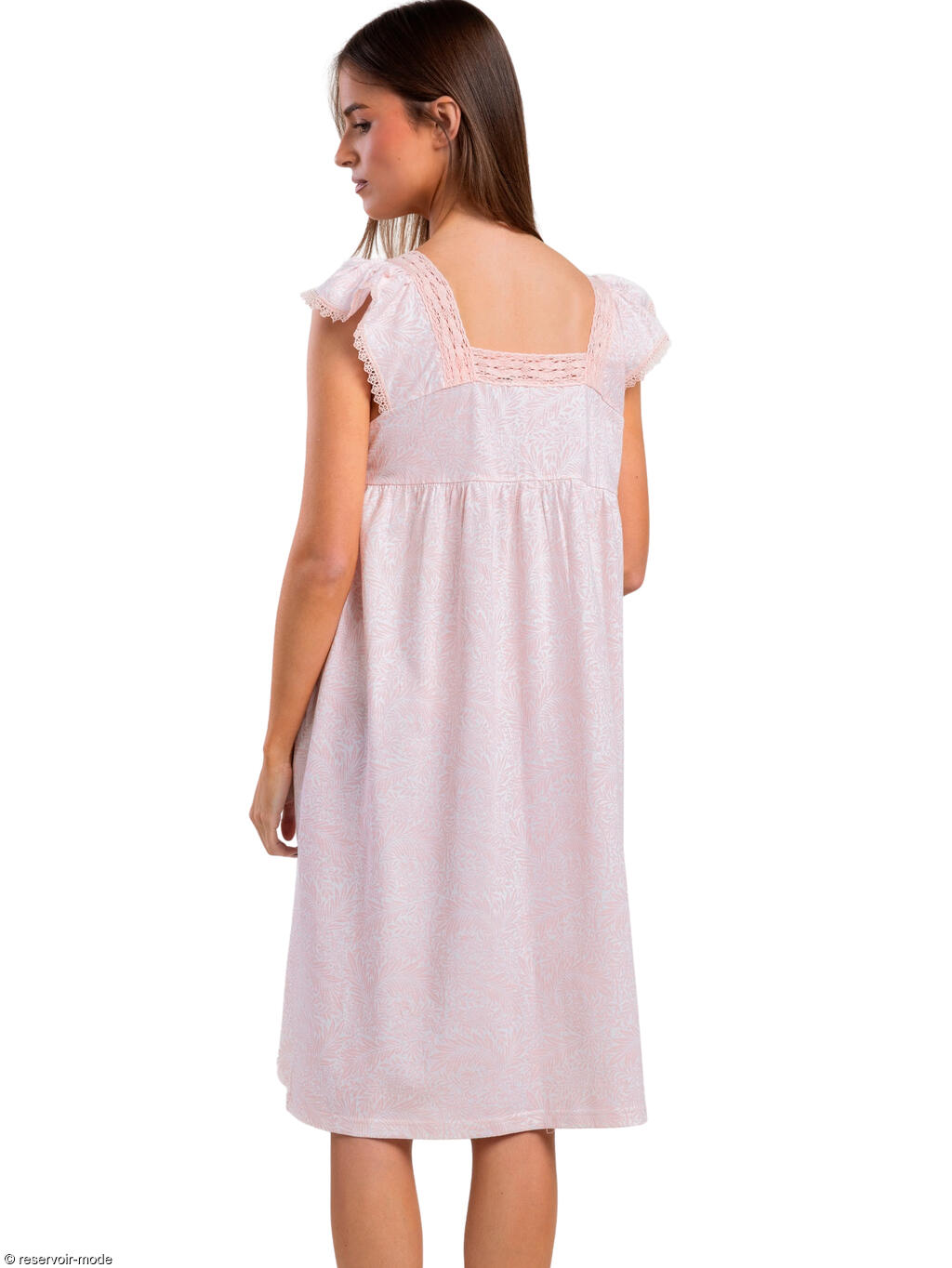 Cette chemise de nuit de maternité allie douceur, confort et féminité. De coupe ample et fluide, elle tombe sous le genou pour offrir une grande liberté de mouvement et s’adapter parfaitement aux formes pendant la grossesse. Le tissu entièrement en coton naturel assure une sensation agréable sur la peau, respirante et idéale pour les nuits comme pour les moments de détente à la maison. Le modèle présente une encolure carrée à l'avant et dans le dos, délicatement ornée de dentelle et de petits détails ajourés guipure, apportant une touche romantique. Les manches courtes à volants en dentelle renforcent son style doux et élégant. Un empiècement sous la poitrine souligne délicatement la silhouette tout en laissant de l’aisance au niveau du ventre. Une patte boutonnée discrète à l’avant facilite l’enfilage et peut également être pratique pour l’allaitement. Sa teinte rose poudré, douce et lumineuse, agrémentée d’un motif discret ton sur ton, renforce son style tendre et apaisant. À la fois confortable, respirante et élégante, cette chemise de nuit est idéale pour les nuits de grossesse, le séjour à la maternité ou les moments de détente à la maison. Livrée dans une boîte-coffret collection Classic Admas.
