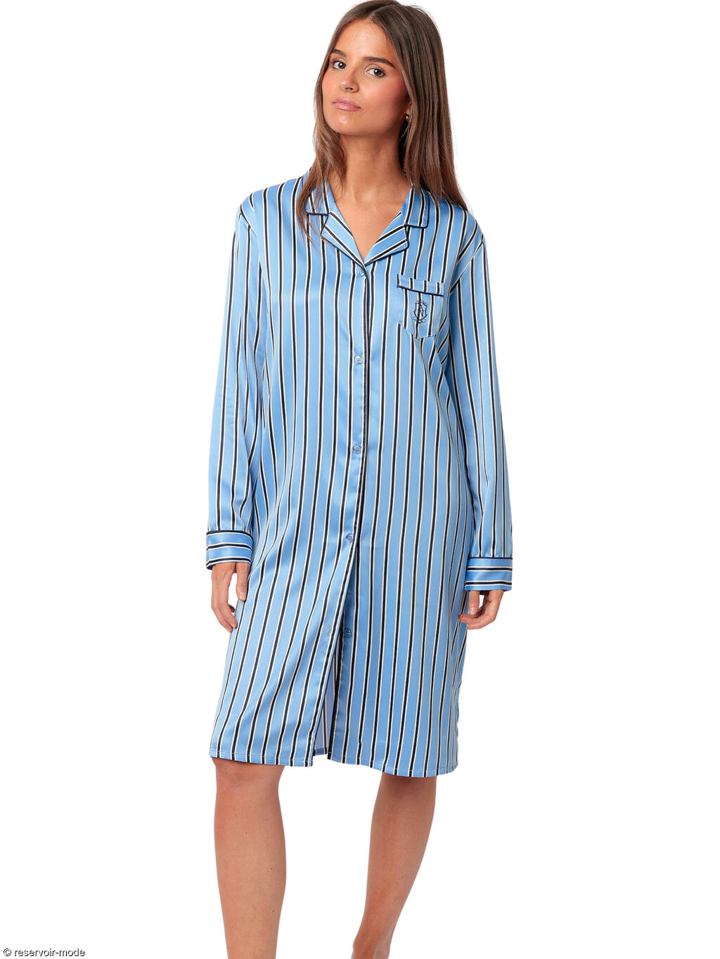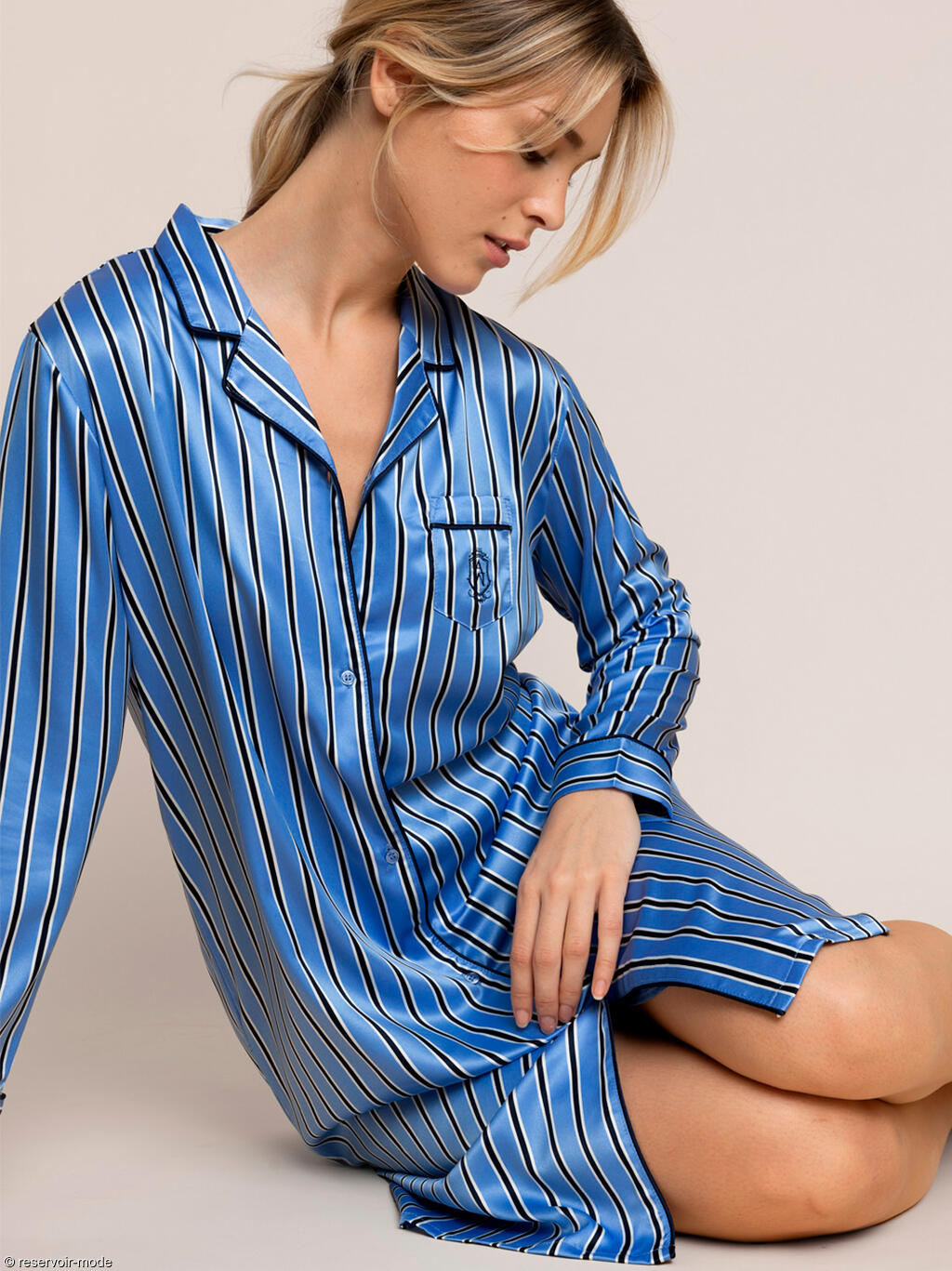 Chemise de nuit sophistiquée et moderne, portée par son tissu à l’aspect satiné, qui reflète légèrement la lumière et lui donne un rendu luxueux. La matière est fluide, douce et fraîche, idéale pour offrir une sensation de confort raffiné durant la nuit. Elle est conçue dans un bleu lumineux, rythmé de rayures verticales noires et blanches qui allongent visuellement la silhouette tout en apportant un charme graphique très actuel.  L’effet global est chic, contemporain et parfaitement équilibré. Le col tailleur classique, typique des pyjamas traditionnels, est revisité dans un esprit féminin. Une fermeture boutonnée sur toute la longueur permet un enfilage aisé et un ajustement modulable. Une poche poitrine, décorée d’un petit motif brodé, offre une subtile touche de style qui personnalise la pièce. Les manches longues avec poignets travaillés sont agrémentées de fins liserés rappelant le motif rayé. Coupe droite, juste au-dessus du genou, offrant confort et liberté de mouvement tout en conservant une ligne élégante. Cette chemise de nuit combine confort, modernité et sophistication, parfaite pour celles qui recherchent une tenue de nuit à la fois douce, stylée et agréable à porter. Livrée dans une boîte coffret Admas collection Classic Edition.