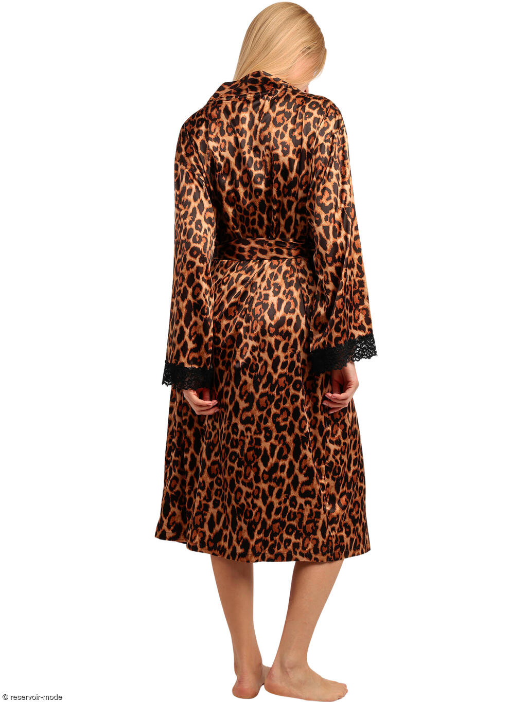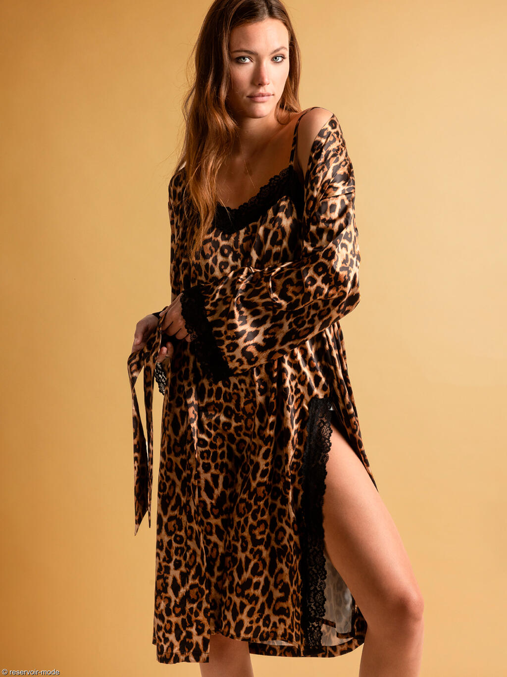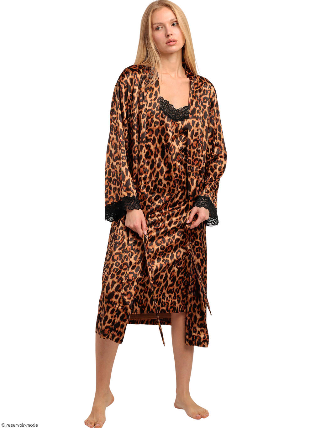 Ce déshabillé en satin se distingue par son allure élégante et enveloppante, pensé pour allier confort et raffinement. Confectionné dans un satin fluide et soyeux, ilprésente un imprimé léopard aux nuances chaudes, rehaussé par un léger éclat qui capte subtilement la lumière. Le tissu glisse naturellement sur la silhouette et offre un tombé souple et gracieux. La coupe est longue, arrivant sous le genou, avec une forme droite et ample qui assure une grande liberté de mouvement. L’ouverture frontale est soulignée par un col châle délicat, apportant une finition élégante et structurée. Une ceinture à nouer, réalisée dans le même satin, permet d’ajuster la robe de chambre à la taille selon l’envie, pour un porté plus ou moins ajusté. Les manches longues sont terminées par de fines bordures de dentelle noire, ajoutant une touche féminine et sophistiquée. Ce déshabillé en satin vous offrira une silhouette chic et confortable, idéal pour compléter un ensemble de nuit tout en apportant une note luxueuse et intemporelle aux moments de détente à la maison. Livré dans une boîte-coffret collection Luxury Admas.