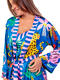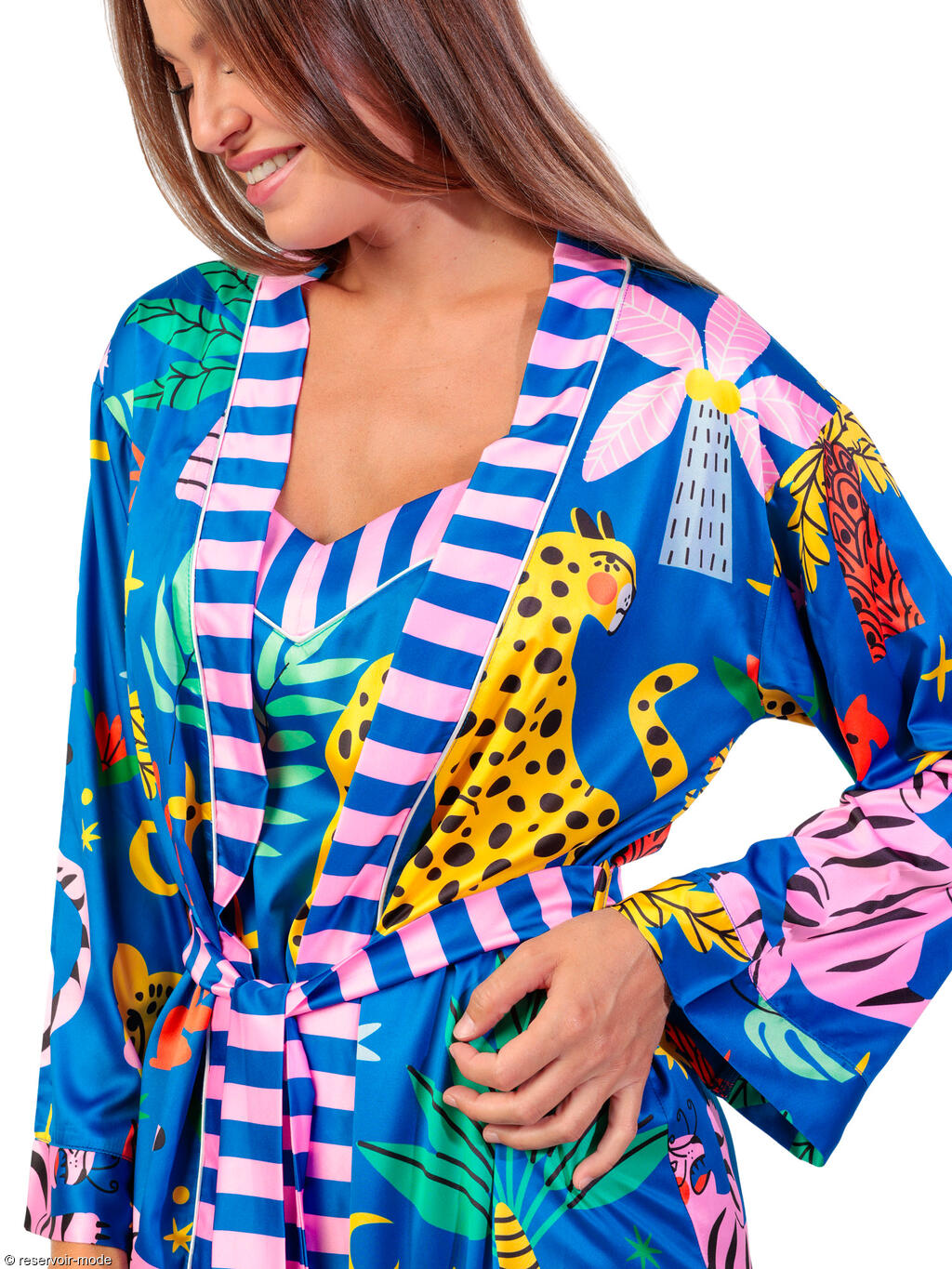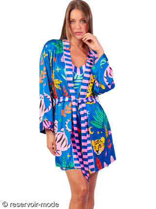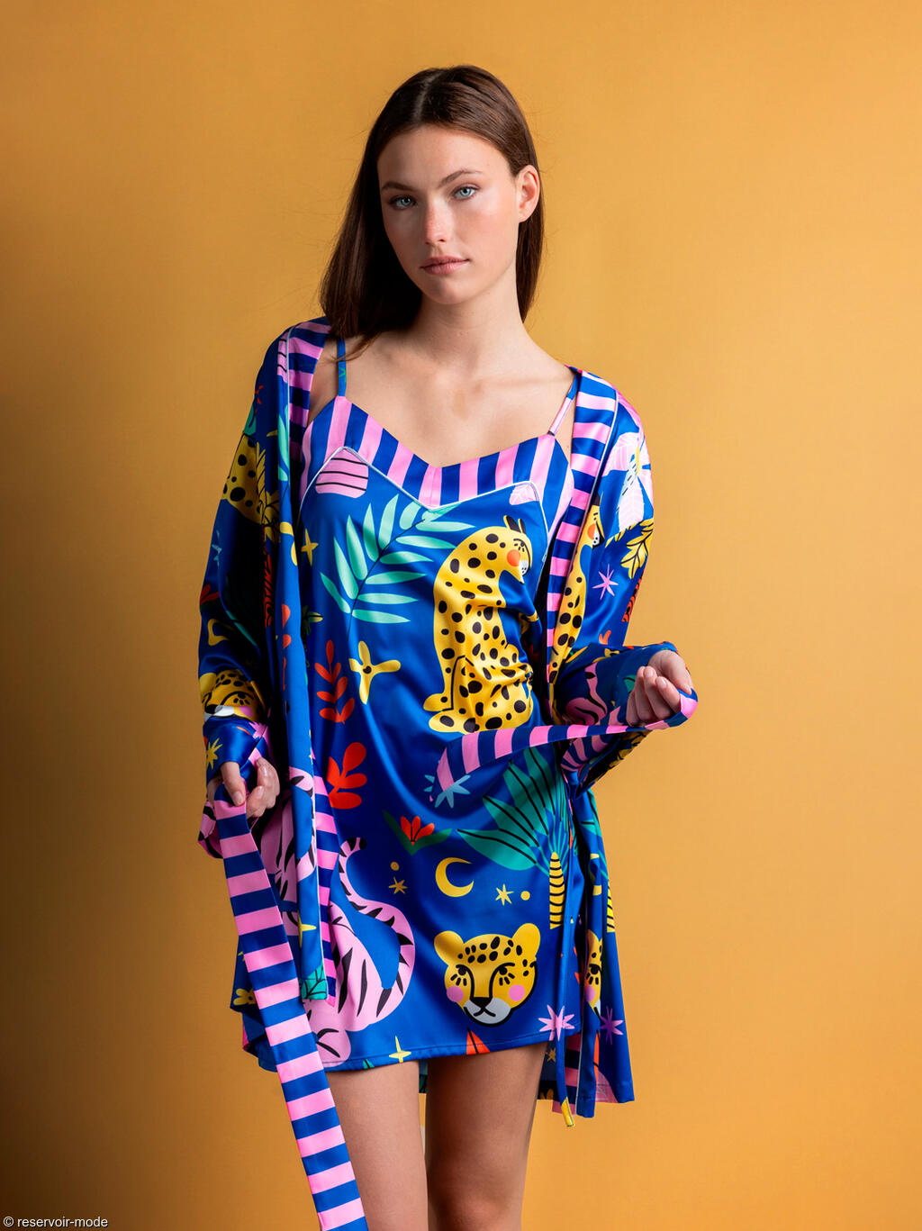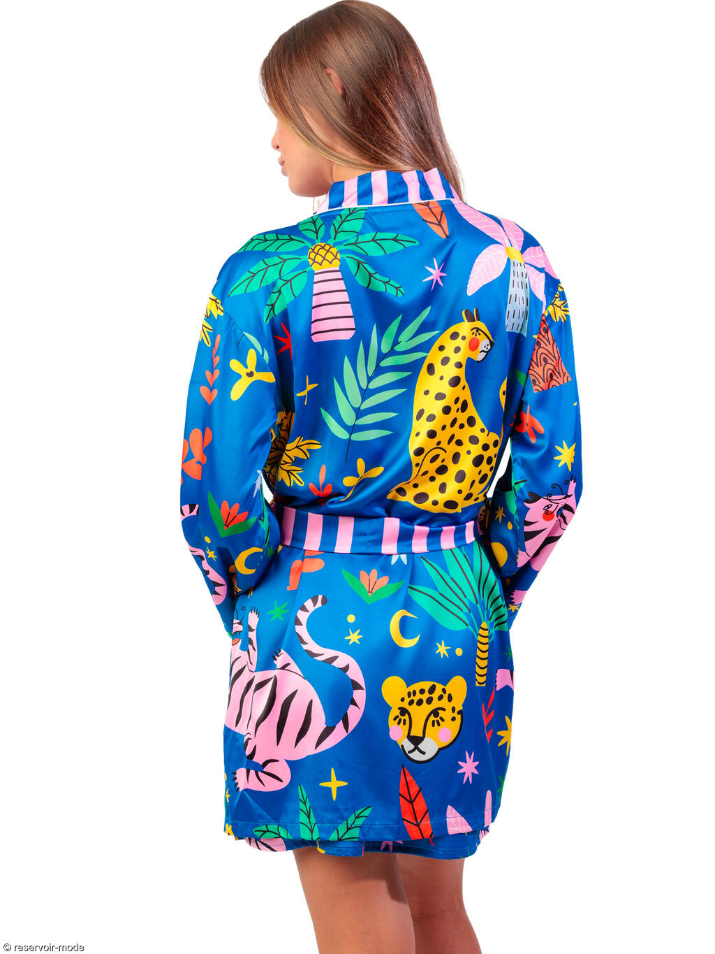 Déshabillé à l’allure à la fois exotique, ludique et raffinée. Il est confectionné dans un tissu satiné qui capte joliment la lumière et apporte une touche de douceur et d’élégance. La palette de couleurs est vive et vibrante : un bleu roi profond sert de toile de fond à une profusion de motifs tropicaux et de formes graphiques. On y retrouve des feuillages luxuriants, des fleurs stylisées, des éléments abstraits et surtout un léopard jaune à taches noires, emblème de l’imprimé, qui confère à l’ensemble une touche sauvage et artistique. Ses pans sont délicatement soulignés par un empiècement à rayures verticales roses et bleues, créant un contraste frais et moderne. Ces mêmes rayures se répètent sur la ceinture qui permet de le fermer à la taille. La coupe est légère et confortable, idéale pour les nuits d’été ou pour se détendre à la maison avec style. Ce déshabillé évooque les voyages sous les tropiques, la joie, et une féminité pétillante assumée. Livré dans une boîte-coffret collection Luxury Admas.