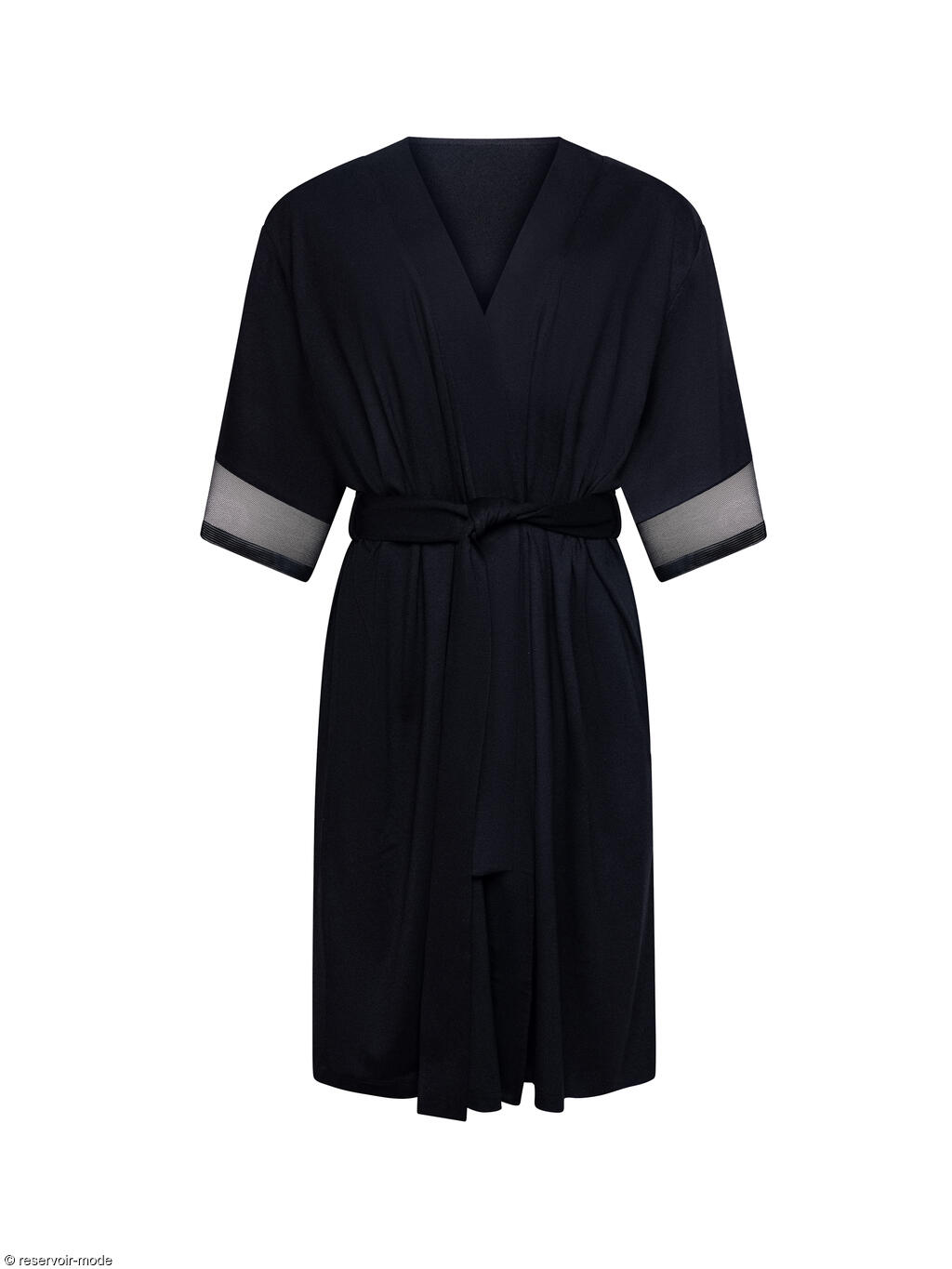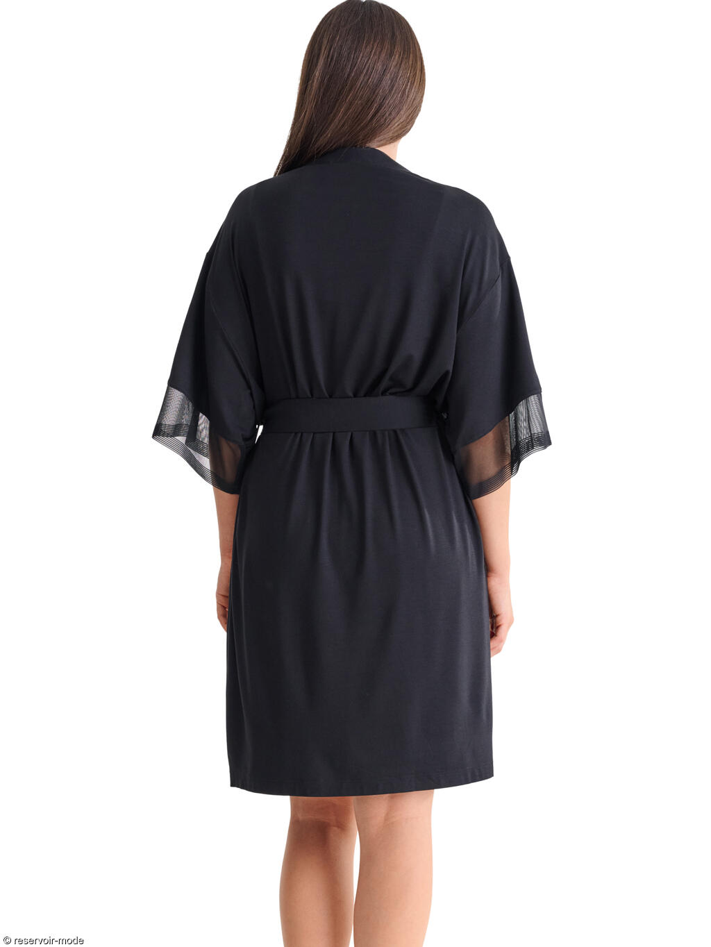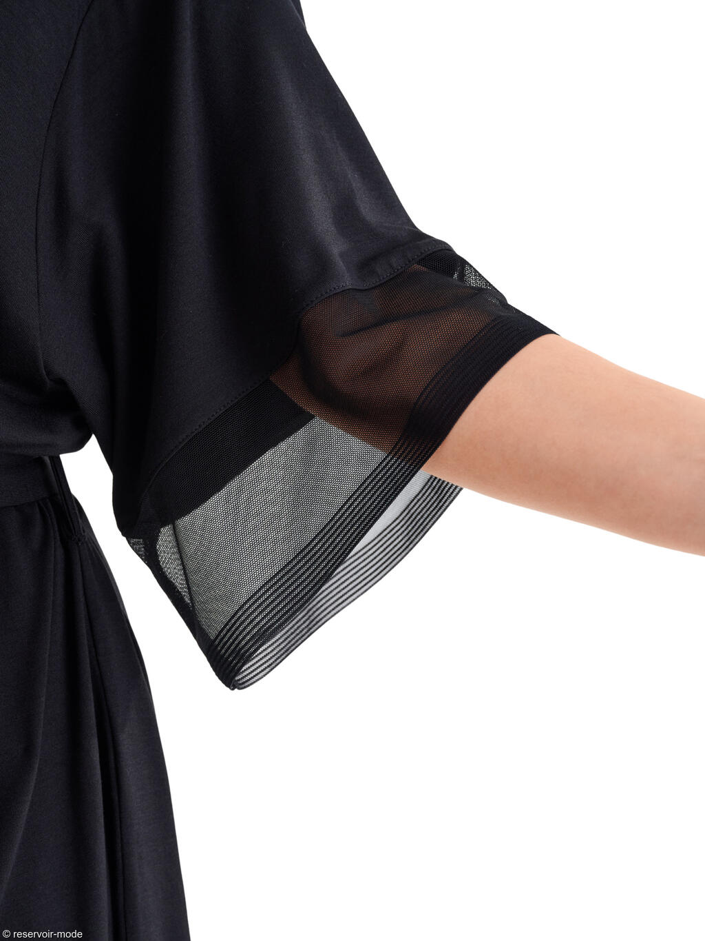 Robe de chambre ample avec des manches kimono trois-quart, arborant un détail décoratif en tulle. Large ceinture à nouer à la taille, coupe tendance, confortable et pratique. Confectionné en maille viscose douce et légère sur la peau. Longueur environ 100 cm.