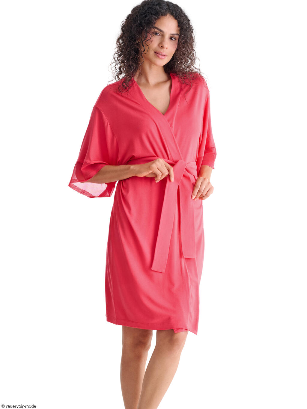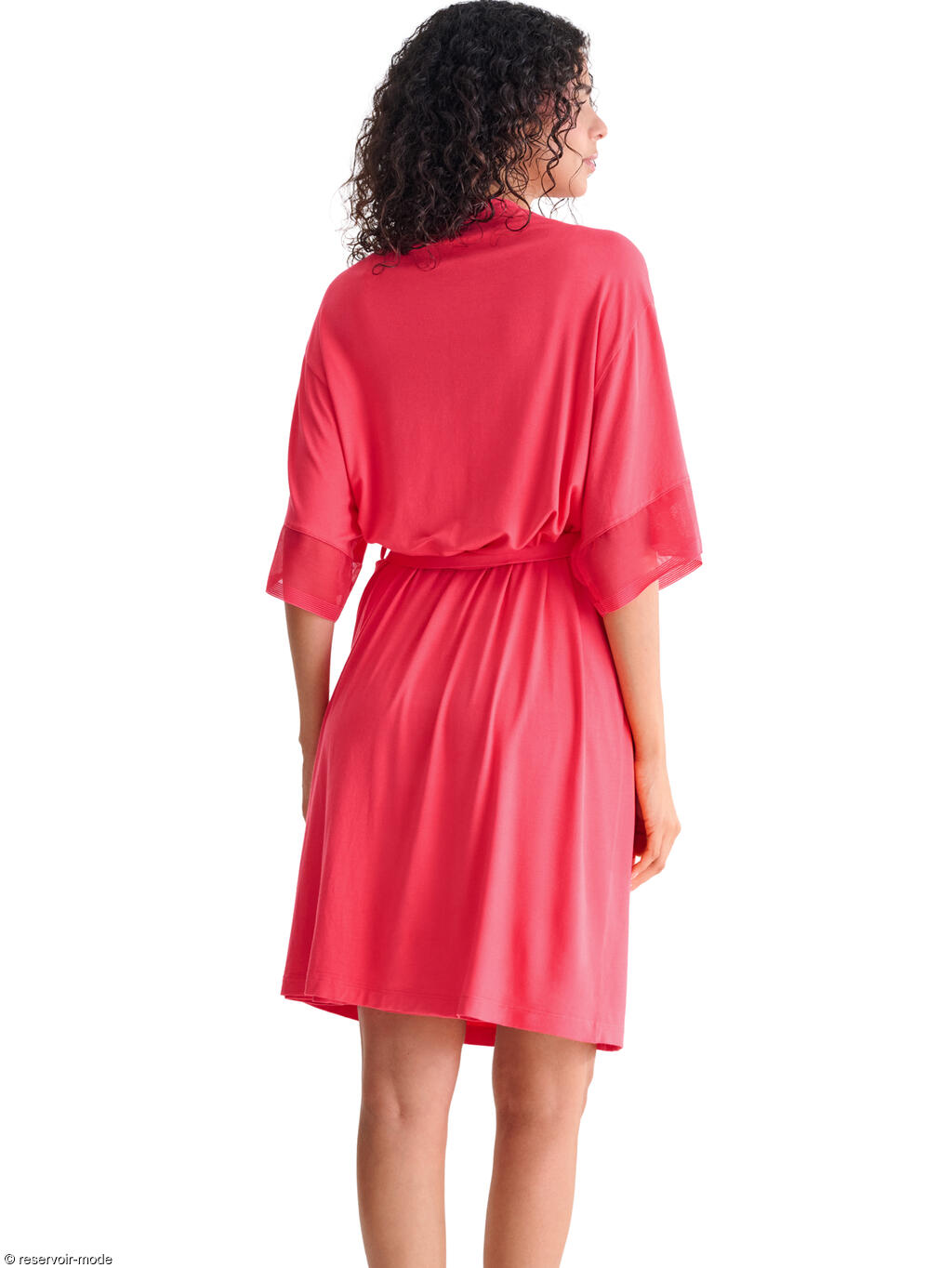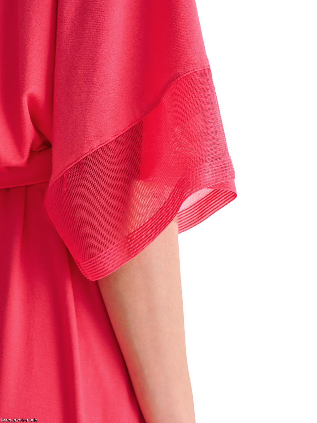 Robe de chambre ample avec des manches kimono trois-quart, arborant un détail décoratif en tulle. Large ceinture à nouer à la taille, coupe tendance, confortable et pratique. Confectionné en maille viscose douce et légère sur la peau. Longueur environ 100 cm.