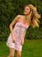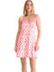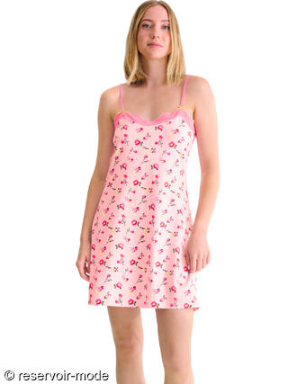 Nuisette à bretelles fines réglables, dans un coton tricoté confortable à imprimé floral subtil qui ajoute une touche féminine et délicate. L'encolure est ornée d'une fine dentelle romantique, et l'avant est rehaussé de rubans contrastés aux couleurs vives. Longueur environ 90 cm.