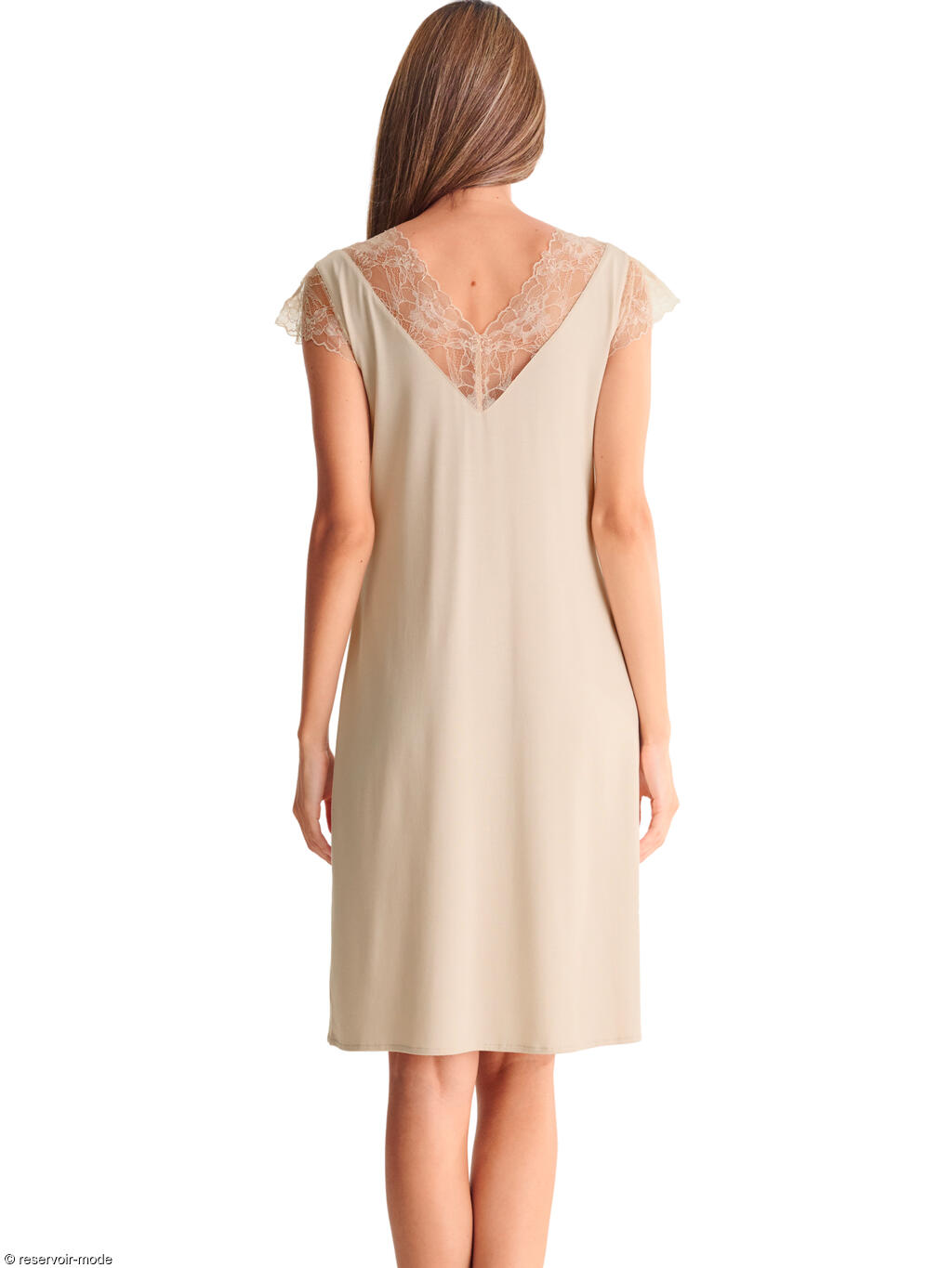 Modèle avec un luxueux décolleté en V en dentelle, particulièrement profond dans le dos, dévoilant subtilement et audacieusement le dos. La dentelle sur les épaules allonge la silhouette et suggère des manches courtes. Une fente plus longue sur le côté à l'avant, comme détail séduisant et esthétique. Longueur environ 95 cm.