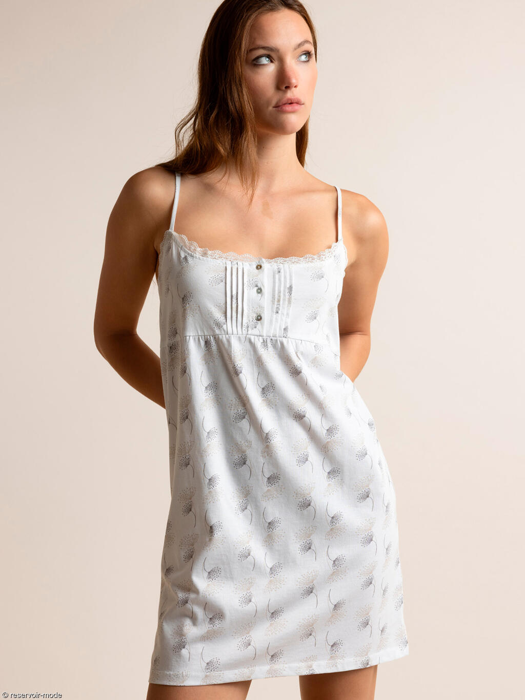 Cette nuisette se distingue par son allure délicate et féminine, alliant légèreté et élégance. Elle est courte, s’arrêtant au-dessus des genoux, et confectionnée entièrement en tissu coton fluide et doux de couleur blanche rehaussé d’un imprimé subtil de motifs floraux gris argenté qui apportent une touche raffinée et discrète. Le haut du buste est orné de fines bretelles réglables, permettant un ajustement parfait, et souligné d’une dentelle délicate qui encadre joliment le décolleté. Au centre, quelques petits plis nervurés et boutons décoratifs ajoutent du charme et une finition soignée. La taille empire, marquée juste sous la poitrine, offre une coupe fluide et flatteuse qui tombe avec légèreté sur les hanches. Cette nuisette évoque la féminité naturelle et la douceur, idéale pour les nuits d’été ou pour un moment de détente élégant. Son style romantique et raffiné en fait une pièce à la fois confortable et séduisante. Livrée dans une boîte-coffret collection Classic Admas.