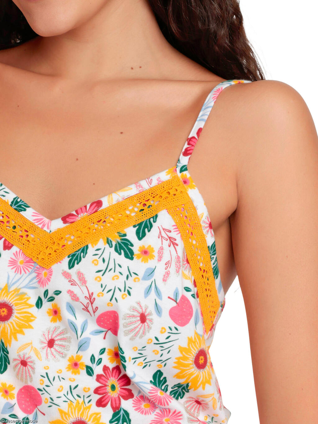 Ensemble de pyjama composé d’un débardeur léger et d’un short assorti, confectionnés dans un tissu mi-coton mi-viscose doux et fluide. Le tissu est décoré d’un motif floral très coloré, accompagné de feuilles vertes, créant une ambiance joyeuse et estivale. Le fond blanc du tissu fait ressortir les couleurs vives et donne au pyjama un aspect frais et lumineux. Le haut possède un décolleté en V souligné par une bande de dentelle jaune qui ajoute une touche lumineuse et féminine.  Les fines bretelles sont réglables pour un ajustement parfait. Le short, coordonné au haut, est ample et confortable, dans une coupe courte et fluide pensée pour le confort, avec une ceinture élastiquée et un lien de serrage jaune. L’ensemble donne une impression fraîche, joyeuse et estivale, parfait pour un pyjama léger et confortable. À la fois agréable et ravissant, il est parfait pour se détendre tout en ajoutant une note de style lumineux et plein de bonne humeur. Livré dans une boîte-coffret collection Admas.