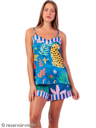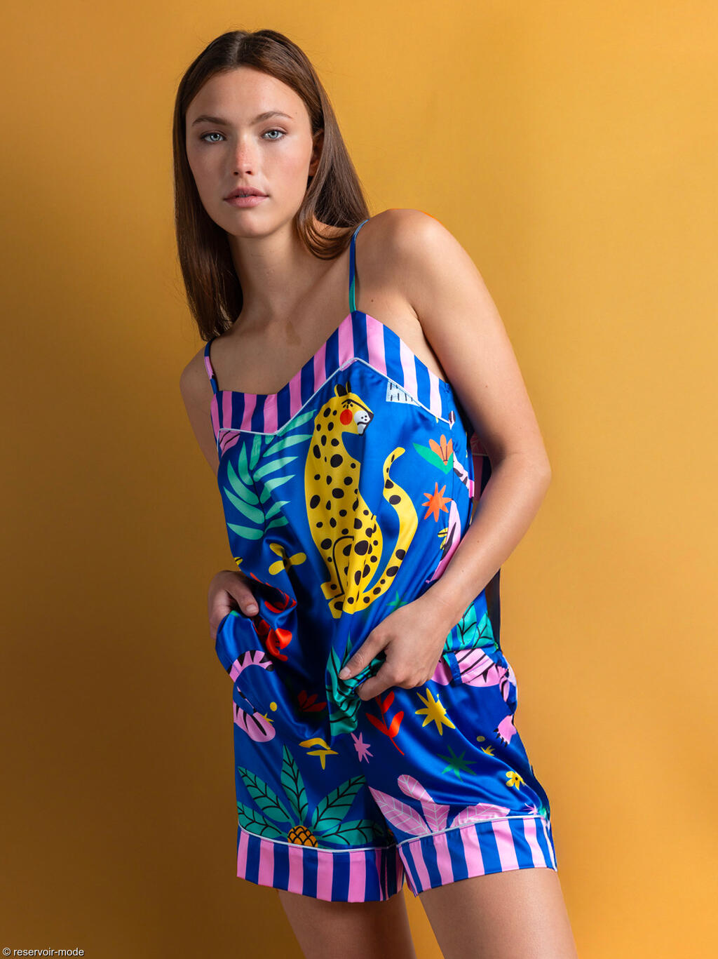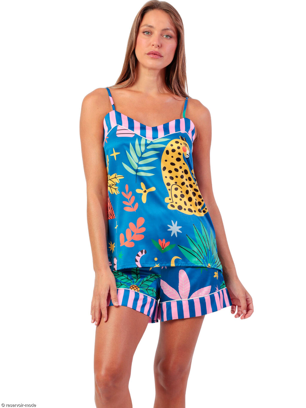 Ce pyjama est un ensemble à l’allure à la fois exotique, ludique et raffinée. Il se compose d’un haut à fines bretelles et d’un short fluide assorti, confectionnés dans un tissu satiné qui capte joliment la lumière et apporte une touche de douceur et d’élégance. La palette de couleurs est vive et vibrante : un bleu roi profond sert de toile de fond à une profusion de motifs tropicaux et de formes graphiques. On y retrouve des feuillages luxuriants, des fleurs stylisées, des éléments abstraits et surtout un léopard jaune à taches noires, emblème de l’imprimé, qui confère à l’ensemble une touche sauvage et artistique. Le décolleté en V du haut est délicatement souligné par un empiècement à rayures verticales roses et bleues, créant un contraste frais et moderne. Ces mêmes rayures se répètent en bordure du short, apportant une harmonie visuelle. La coupe est légère et confortable, idéale pour les nuits d’été ou pour se détendre à la maison avec style. Ce pyjama évoque les voyages sous les tropiques, la joie, et une féminité pétillante assumée. Livré dans une boîte-coffret collection Luxury Admas.