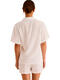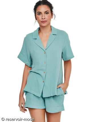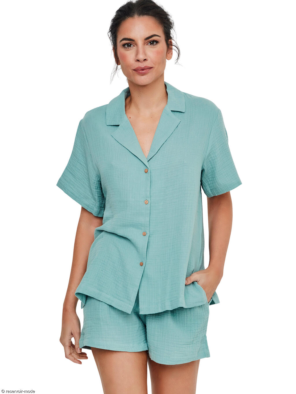 Cet ensemble de pyjama séduit par son allure à la fois naturelle, élégante et ultra-confortable. Réalisé entièrement en coton léger à texture subtilement gaufrée, il offre un toucher doux et respirant, idéal pour les nuits chaudes comme pour les moments de détente à la maison. Le haut, inspiré d’une chemise, présente une coupe fluide et décontractée qui tombe naturellement sur le corps sans le contraindre. Son col tailleur délicat apporte une touche chic, tandis que les manches courtes renforcent la sensation de fraîcheur. La patte de boutonnage centrale, ponctuée de petits boutons discrets, structure la silhouette. Le short assorti complète l’ensemble avec harmonie. Sa taille entièrement élastiquée assure un maintien confortable et souple, sans marquer la taille. Sa coupe légèrement ample permet une grande liberté de mouvement, parfaite pour dormir ou flâner. Les poches latérales ajoutent une note pratique et moderne. La couleur douce et apaisante évoque la fraîcheur, la sérénité et l’été, renforçant l’impression de bien-être. L’ensemble dégage un style minimaliste, raffiné et intemporel, à mi-chemin entre pyjama et tenue d’intérieur élégante. Un pyjama pensé pour celles qui veulent se sentir bien, belles et à l’aise, sans compromis entre confort et style.