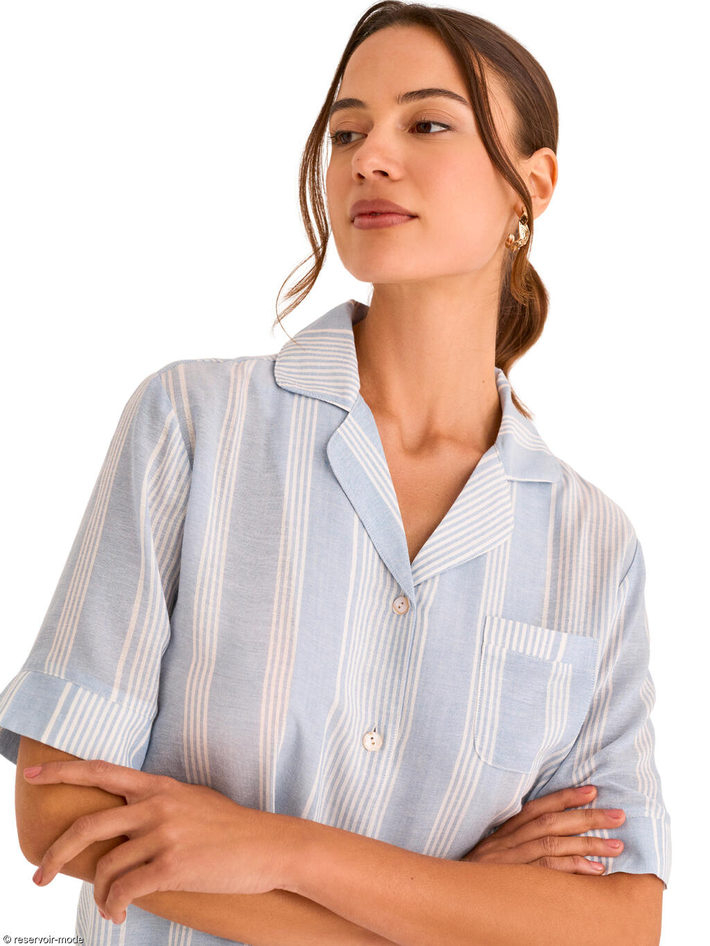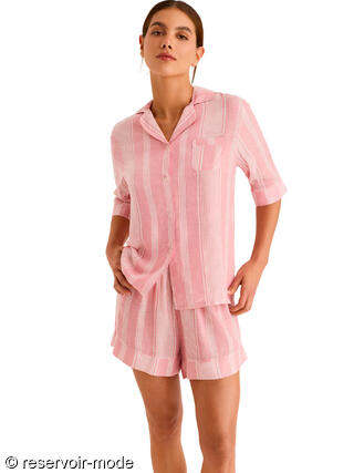 Cet ensemble de pyjama allie raffinement, légèreté et confort, dans un esprit à la fois chic et décontracté. Entièrement en viscose douce, fluide et respirante, il offre un tombé naturel qui épouse les mouvements sans jamais coller à la peau. Agréable au toucher, la viscose procure une sensation de fraîcheur idéale pour les nuits estivales ou les moments de détente à la maison. Le haut, inspiré d’une chemise, présente une coupe droite et souple. Il est doté d’un col tailleur élégant, de manches courtes à revers et d’une fermeture boutonnée sur le devant. Une poche poitrine discrète apporte une touche casual et pratique, tout en renforçant l’allure intemporelle de la pièce. Le short assorti complète l’ensemble avec harmonie. Sa taille élastiquée assure un maintien confortable et une grande liberté de mouvement. Sa coupe légèrement ample offre un porté fluide et naturel, parfait pour se sentir à l’aise en toute circonstance. Le motif de fines rayures verticales blanches allonge visuellement la silhouette et évoque une atmosphère douce et apaisante, rappelant l’univers du linge de maison élégant ou des vacances d’été. Un ensemble de pyjama au style léger, féminin et soigné, pensé pour celles qui recherchent une matière agréable, une coupe confortable et une élégance naturelle jusque dans leurs moments de repos.
