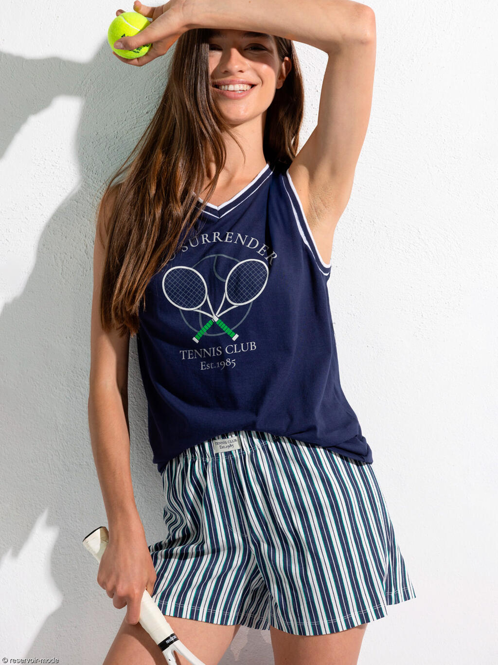 Cet ensemble de pyjama se compose de deux pièces confortables et décontractées, idéales pour la nuit ou les moments de détente à la maison. Le haut sans manches présente une coupe droite et ample, assurant une grande liberté de mouvement. Il est doté d’une encolure en V avec des finitions contrastées qui apportent une touche sportive au col et à l'ouverture des bras. Sur le devant, un motif graphique à thème tennis accompagné d’une inscription donne du caractère au modèle et renforce son esprit casual. Le short assorti, de longueur mi-cuisse, offre une coupe confortable avec une taille élastiquée, pensée pour un maintien souple sans compression. Son motif à rayures verticales affine visuellement la silhouette et crée un bel équilibre avec le haut. Entièrement en tissu coton, cet ensemble est respirant, doux au toucher et agréable à porter, parfait pour des nuits confortables tout en conservant un style moderne et soigné. Livré dans une boîte-coffret collection Admas.