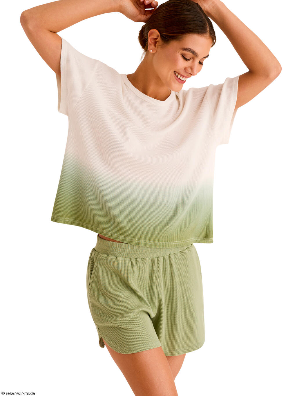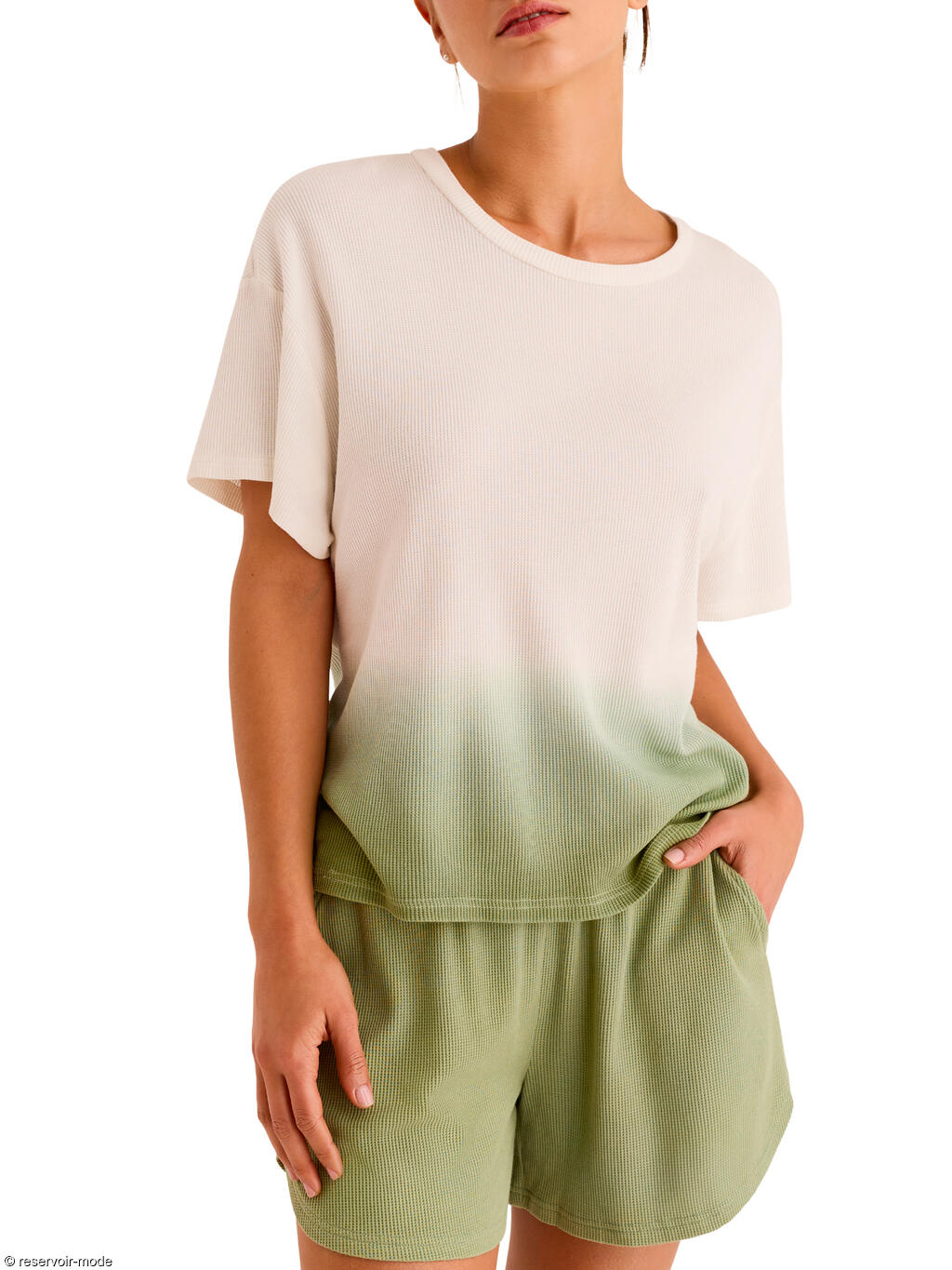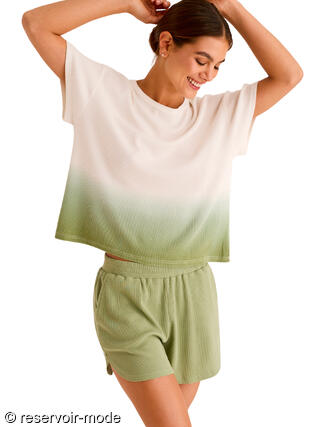 Cet ensemble de pyjama incarne une allure décontractée et raffinée, pensée pour le confort. Confectionné dans un mélange délicat de coton et de viscose, il offre une sensation de légèreté et de douceur immédiate au contact de la peau. Le coton garantit une excellente respirabilité et un confort naturel, tandis que la viscose apporte une fluidité subtile, donnant au tissu un tombé souple et agréable, presque soyeux. Le haut à col rond et manches courtes, à la coupe droite et légèrement ample, tombe avec naturel sur la silhouette. Son design épuré est sublimé par un dégradé harmonieux. Le short assorti, à taille élastiquée, épouse la taille sans comprimer et assure une liberté de mouvement optimale. Sa coupe fluide et confortable est idéale pour la nuit comme pour les moments de détente à la maison. Les poches latérales ajoutent une touche fonctionnelle. La couleur tendre, en parfaite continuité avec le dégradé du haut, crée un ensemble visuellement apaisant. Ce pyjama se distingue par son équilibre parfait entre confort, douceur et élégance contemporaine. C’est une tenue de nuit à l’esprit naturel et moderne, conçue pour celles qui recherchent un bien-être absolu enveloppé d’une esthétique soignée et lumineuse.