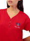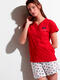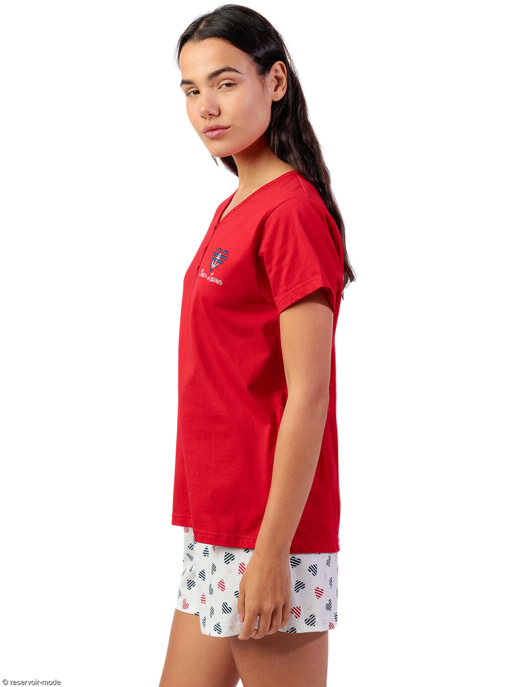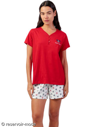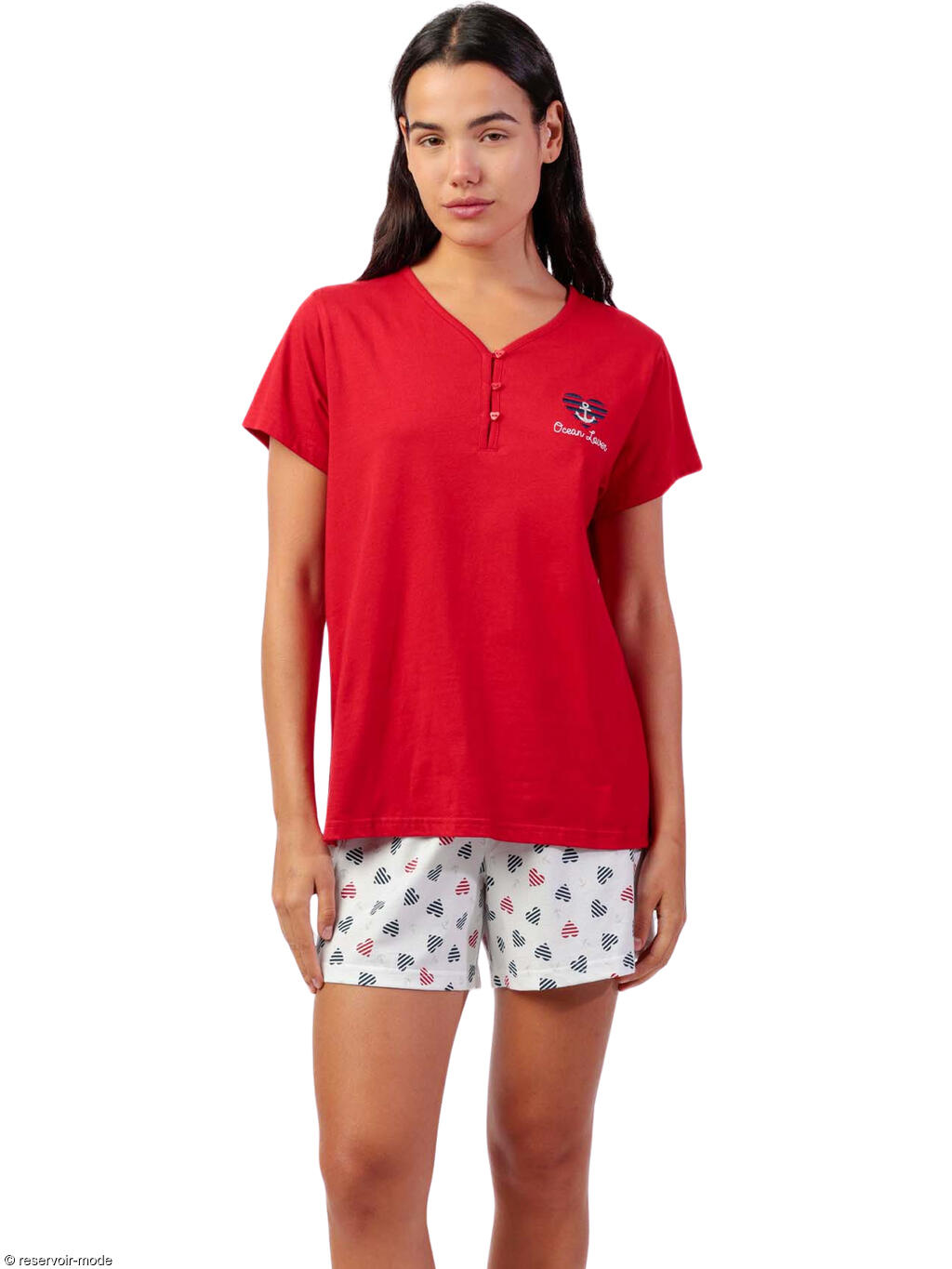Découvrez cet ensemble de pyjama à l'esprit marin, idéal pour des nuits douces et des matinées ensoleillées. Entièrement en tissu coton léger et respirant, il se compose d'un t-shirt à manches courtes et d'un short, et sera très confortable à porter pour vos nuits de printemps et d'été. Le haut rouge éclatant vous enveloppe de confort. Son col en V est doté d'une patte de boutonnage avec des boutons en forme de coeur, qui apportent une touche décontractée et féminine. L'ancre brodée délicatement sur la poitrine signe l'élégance nautique. Le short assorti, orné de petits motifs de coeurs striés dans les tons de bleu, rouge et blanc, insuffle une dose de gaieté à votre tenue de nuit. Léger et aéré, il est parfait pour les chaudes soirées d'été ou simplement pour flâner à la maison avec style. Que vous soyez au bord de la mer ou que vous rêviez d'évasion, ce pyjama est l'invitation parfaite à la détente et au bien-être. Livré dans une boîte-coffret collection Admas.