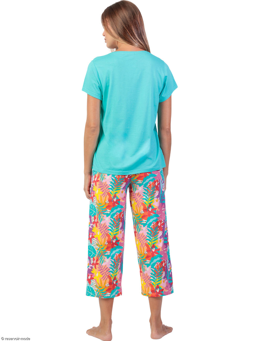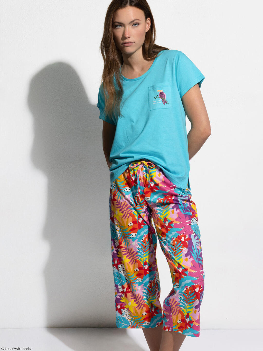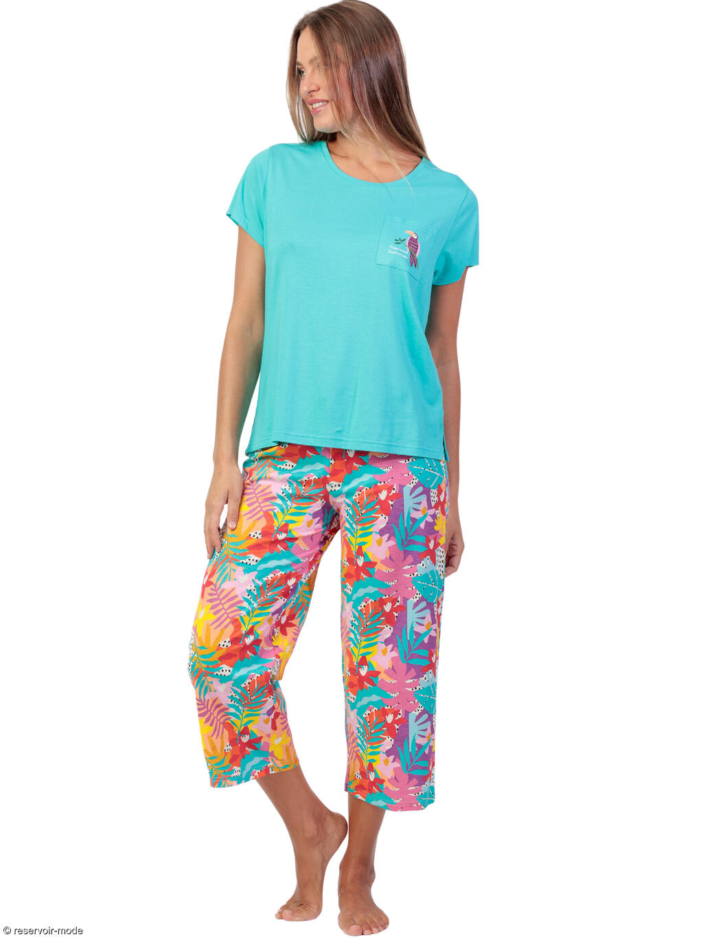 Cet ensemble de pyjama, en tissu mi-coton mi-viscose léger et agréable, respire la bonne humeur et la détente tropicale. Le haut est un t-shirt fluide à la coupe décontractée, dans un bleu turquoise éclatant qui évoque le lagon. Le tissu est doux et léger, parfait pour la nuit ou les matinées tranquilles. Les manches sont légèrement tombantes, ce qui renforce l’allure confortable. Sur la petite poche poitrine, un joli motif de perroquet perché sur une branche apporte une touche exotique pleine de charme. Le pantalon de longueur 3/4 offre un style frais et pratique, idéal pour les saisons douces. Son imprimé est un festival de couleurs tropicales : des feuillages luxuriants dans des tons vifs colorés se mêlent sur un fond clair. Le motif, très vivant, évoque une jungle en fleurs au coucher du soleil. L’ensemble marie confort et fantaisie : la coupe est ample et fluide, la matière est respirante, et les couleurs vitaminées donnent instantanément le sourire. C’est un pyjama parfait pour se sentir à la fois à l’aise et joyeuse, comme en vacances même à la maison. Livré dans une boîte-coffret collection Admas.