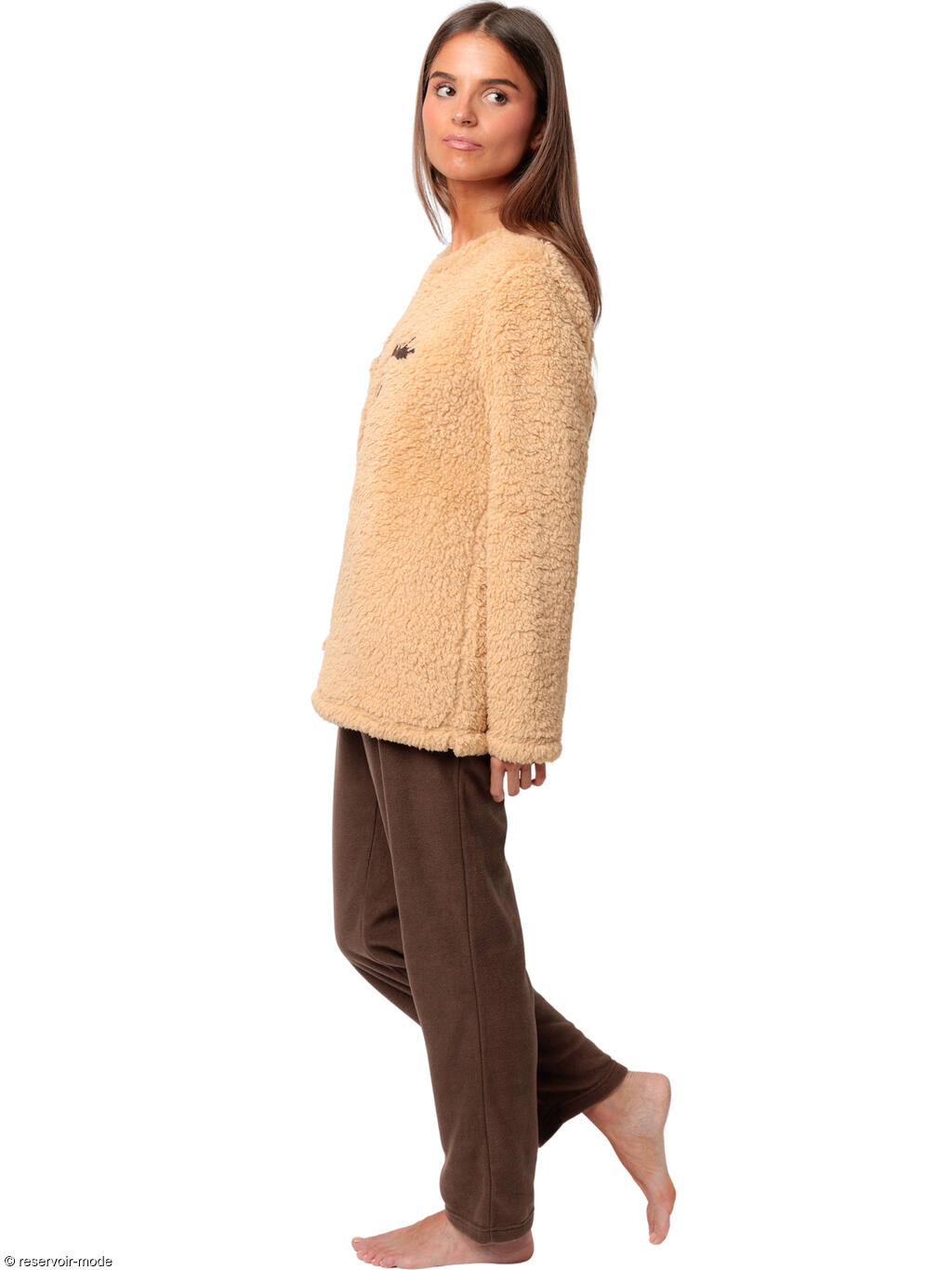 Ce pyjama a une allure chaleureuse et cocooning, parfait pour l’hiver. Le haut est confectionné dans un tissu polaire sherpa, très duveteux et moelleux, offrant un effet peluche irrésistible. Sa couleur beige camel renforce cette impression de douceur et de confort. Sur le devant, on trouve un motif de renne brodé, avec des bois foncés, un museau rouge volumineux et une petite écharpe rayée : des détails brodés qui ajoutent du relief et un charme festif. La coupe est droite et ample, avec un col rond et des manches longues, idéale pour se sentir bien au chaud. Le pantalon est réalisé en tissu micropolaire, plus fin que le sherpa mais tout aussi doux et chaud sur la peau. Il est de couleur brun chocolat, ce qui s’accorde parfaitement au haut. Sa coupe est simple et confortable, légèrement ample, pour une liberté de mouvement optimale. L’ensemble donne un pyjama douillet, hivernal et ludique, parfait pour les soirées de détente ou pour cultiver l’esprit de Noël à la maison. Livré dans une boîte-coffret Admas, idéale à offrir en cadeau.