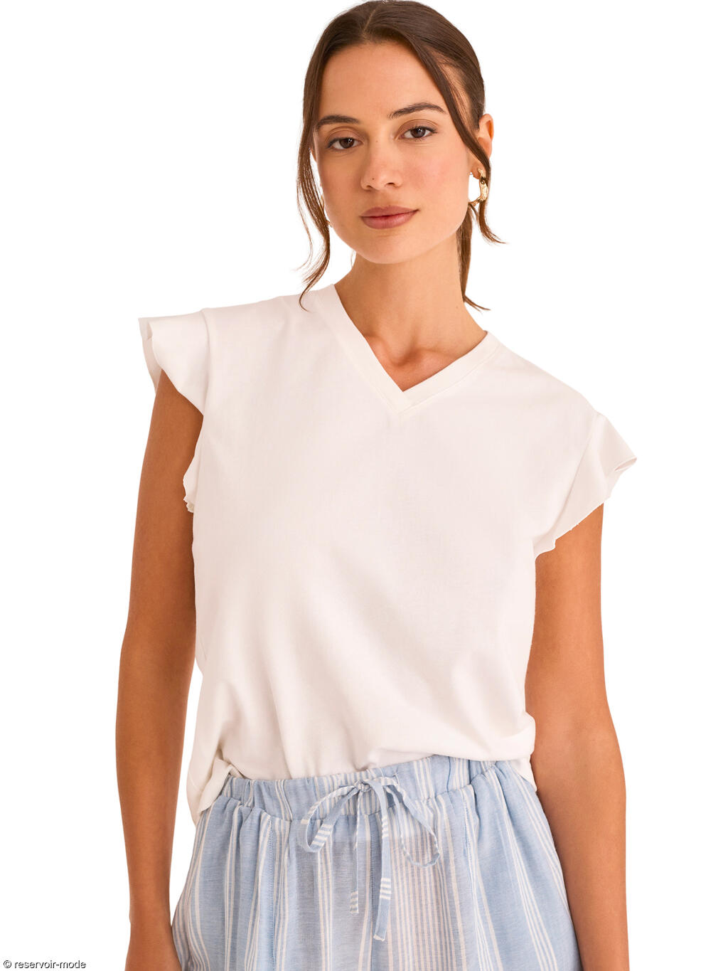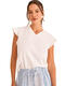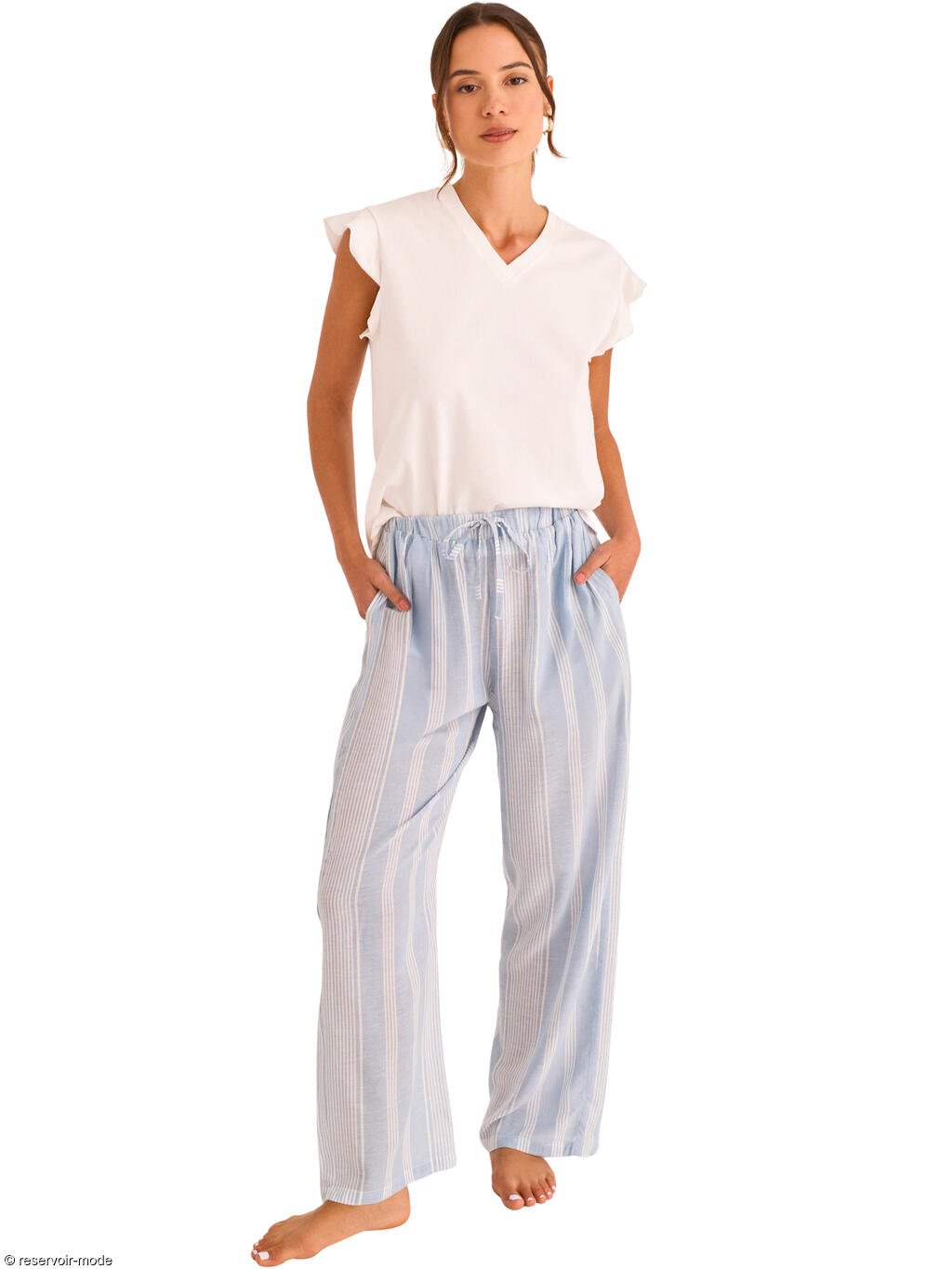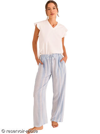 Cet ensemble de pyjama a une allure douce et élégante, parfaite pour le confort à la maison. Le haut, entièrement en coton, est d’un blanc lumineux. Il présente une coupe fluide avec un col en V délicat et de petites manches légèrement volantées, ce qui lui donne une touche féminine et légère. Le coton apporte une sensation naturelle, respirante et agréable sur la peau. Le bas, entièrement en viscose, contraste subtilement avec sa teinte à fines rayures blanches verticales. Sa coupe droite et ample assure une grande liberté de mouvement, tandis que la taille élastiquée avec lien de serrage renforce le confort. La viscose donne au pantalon un tombé souple et fluide, idéal pour un pyjama. C’est un pyjama à la fois confortable, léger et raffiné, qui combine des matières naturelles avec un style simple et apaisant, parfait pour les nuits comme pour les moments de détente à la maison.