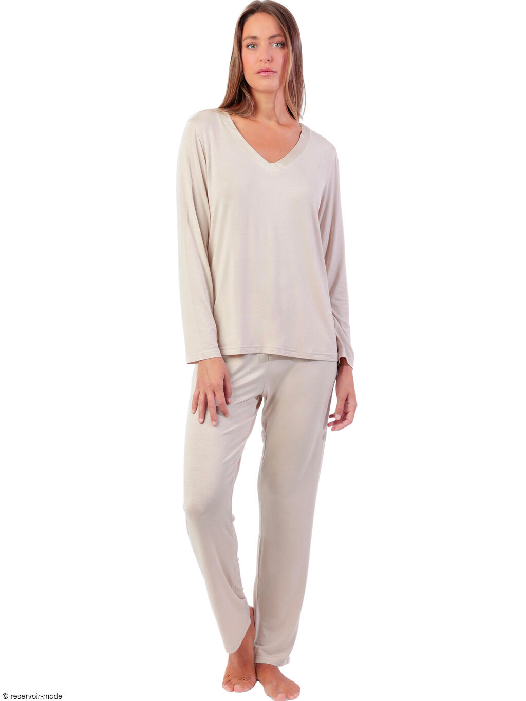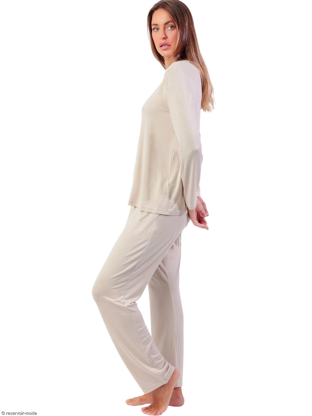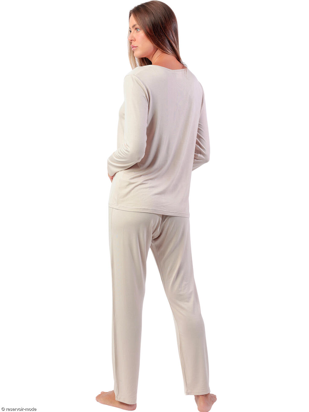 Cet ensemble de pyjama se distingue par son extrême douceur, sa fluidité et son confort seconde peau. Le haut de coupe ample et décontractée est idéal pour bouger librement et se sentir à l’aise. L'encolure en V délicate, en tissu satiné, apporte une touche féminine de sophistication. Manches longues droites, douces et légères, parfaites pour les soirées fraîches ou les moments cocooning. Le pantalon présente une coupe droite fluide, offrant un tombé harmonieux et une grande liberté de mouvement. Cet ensemble offre un look minimaliste et apaisant. Il évoque immédiatement le confort, la légèreté et la relaxation, tout en conservant une élégance naturelle. Le tissu en modal assure une sensation ultra-douce, presque soyeuse, avec un toucher frais et respirant. Il tombe de manière souple et élégante, créant un rendu naturel et légèrement satiné. C’est le pyjama parfait pour celles qui veulent une tenue de nuit à la fois simple, raffinée et incroyablement agréable à porter. Livré dans une boîte coffret Admas collection Luxury.