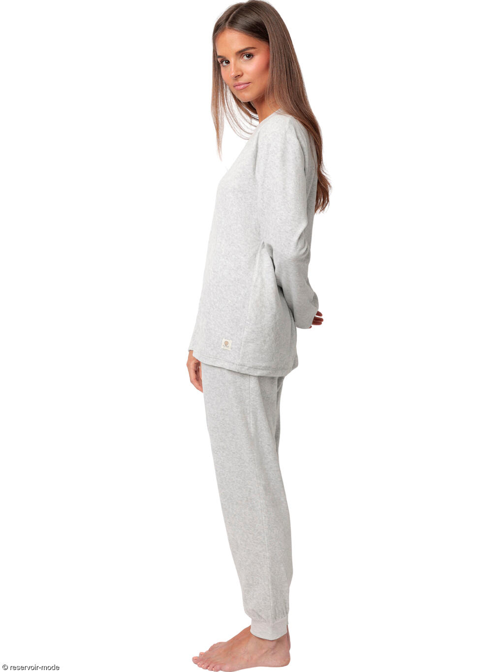 Ce pyjama en velours de coton mélangé offre une sensation de douceur enveloppante et un confort chaleureux idéal pour les soirées cocooning. Son haut à manches longues, coupé de manière ample pour laisser une agréable liberté de mouvement, est orné sur l’avant d’un motif brodé délicat. Le pantalon assorti, confectionné dans la même matière veloutée, présente une coupe décontractée qui tombe naturellement le long de la jambe. Il est doté d’une ceinture élastique et réglable, permettant d’ajuster parfaitement le maintien sans comprimer la taille. Les chevilles légèrement resserrées assurent une tenue confortable et limitent les remontées du tissu pendant le sommeil. L’ensemble, dans une teinte gris clair douce et apaisante, conjugue style minimaliste, confort et chaleur, parfait pour se détendre avec élégance.