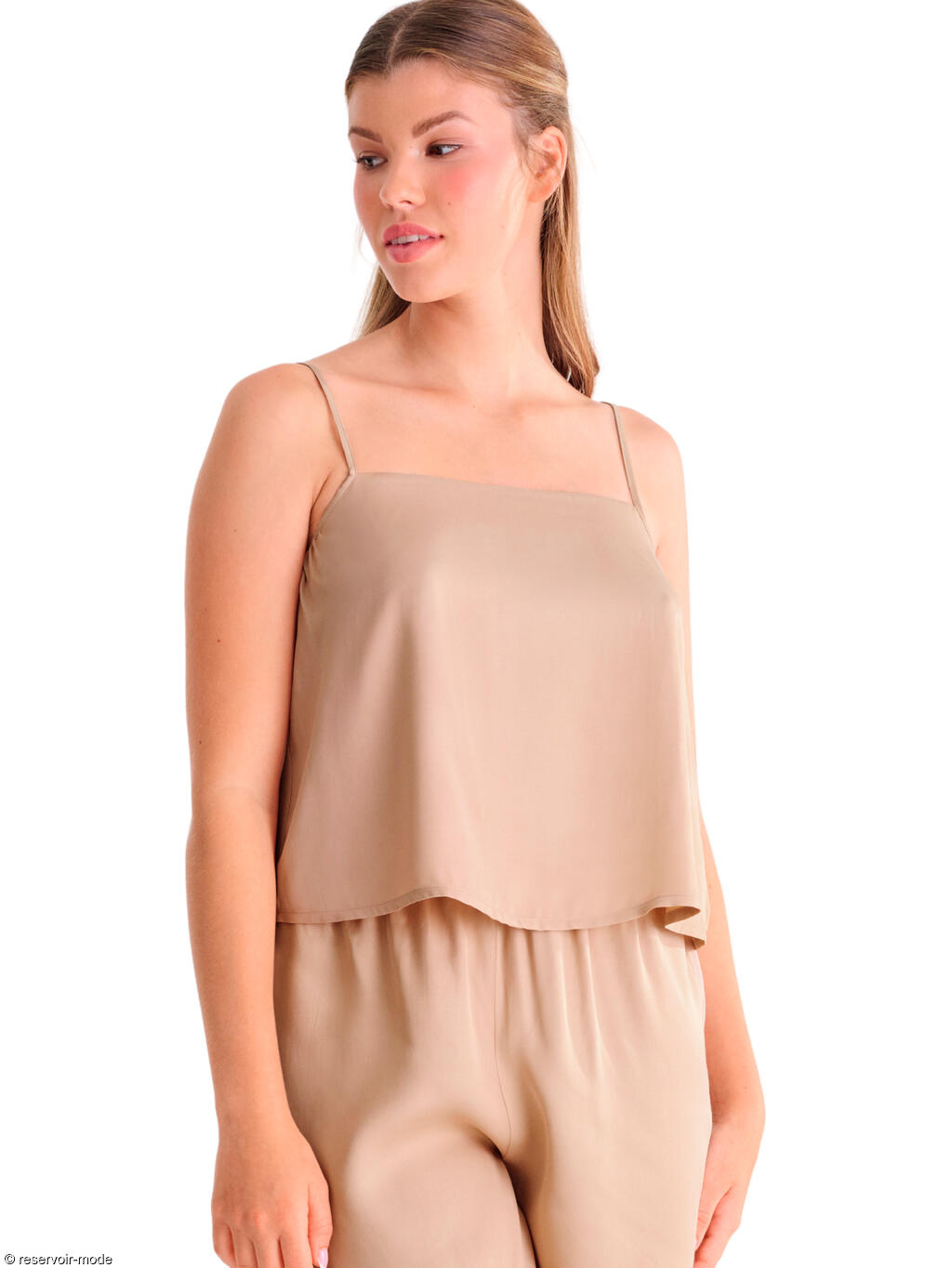 Haut type caraco dans une coupe trapèze, avec de fines bretelles réglables qui présentent un joli détail noué dans le dos. La coupe plus large, tendance et très légère, et le tissu naturel et fluide offrent un confort et une légèreté optimaux. C'est un vêtement tendance et polyvalent qui offre une sensation de confort et de légèreté.
