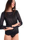 Top à manches longues dans une coupe simple avec encolure ronde ornée de fines paillettes. Il peut être porté comme un sous-vêtement, comme un haut de pyjama pour les nuits festives, ou comme vêtement d'extérieur pour les plus audacieuses.