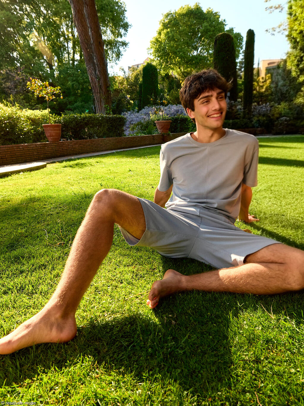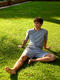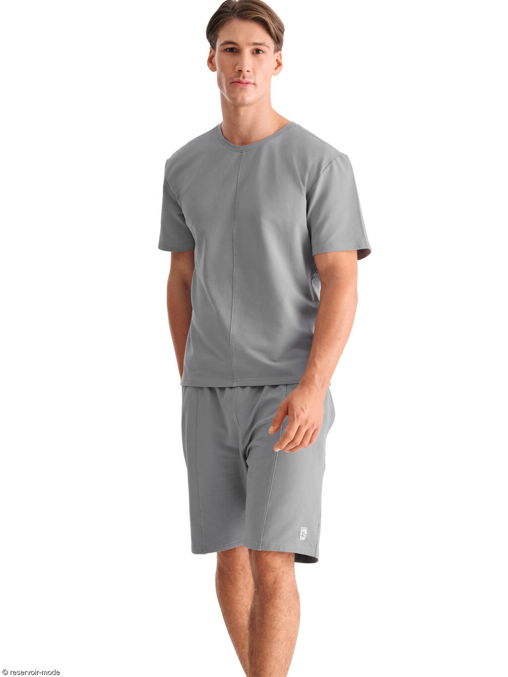 Cet ensemble de pyjama est polyvalent et extrêmement confortable, confectionné dans un tissu coton tricoté doux de couleur gris clair. Il est idéal pour dormir, ou en tenue d'intérieur pour se détendre pendant la journée. Le t-shirt à col rond et manches courtes présente une coupe plus ample avec des manches légèrement plus longues, garantissant une grande liberté de mouvement et soulignant un look moderne. Il est orné d'une couture décorative au centre. Le bas est un short confortable dans la même teinte gris clair, doté de poches latérales pratiques. Sa coupe ample le rend agréable à porter, tandis que les coutures décoratives au centre ajoutent une touche de design raffinée. Sa large ceinture élastique assure une tenue confortable.
