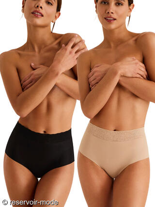 Lot de deux slips taille haute, très confortables, parfaits à porter au quotidien. Une très jolie dentelle vient décorer le tour de la taille pour une touche sophistiquée. Un basique essentiel et indispensable à avoir dans sa lingerie. Gousset entièrement en coton pour un confort intime garanti.