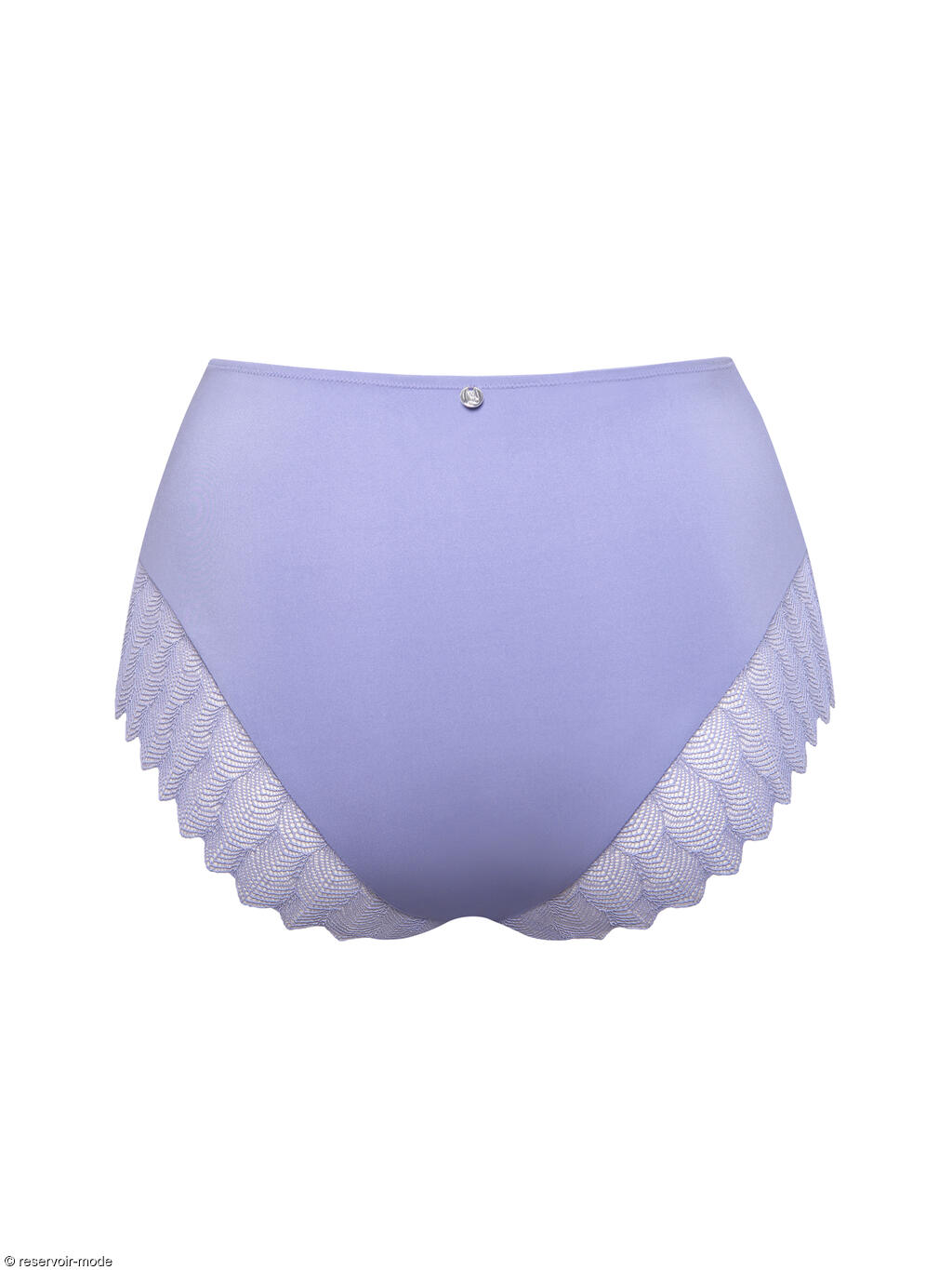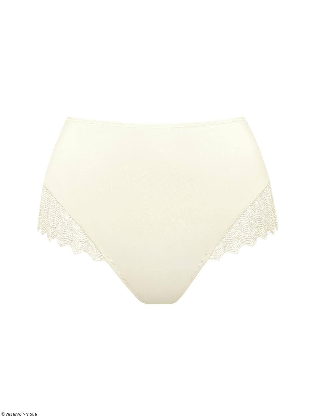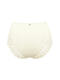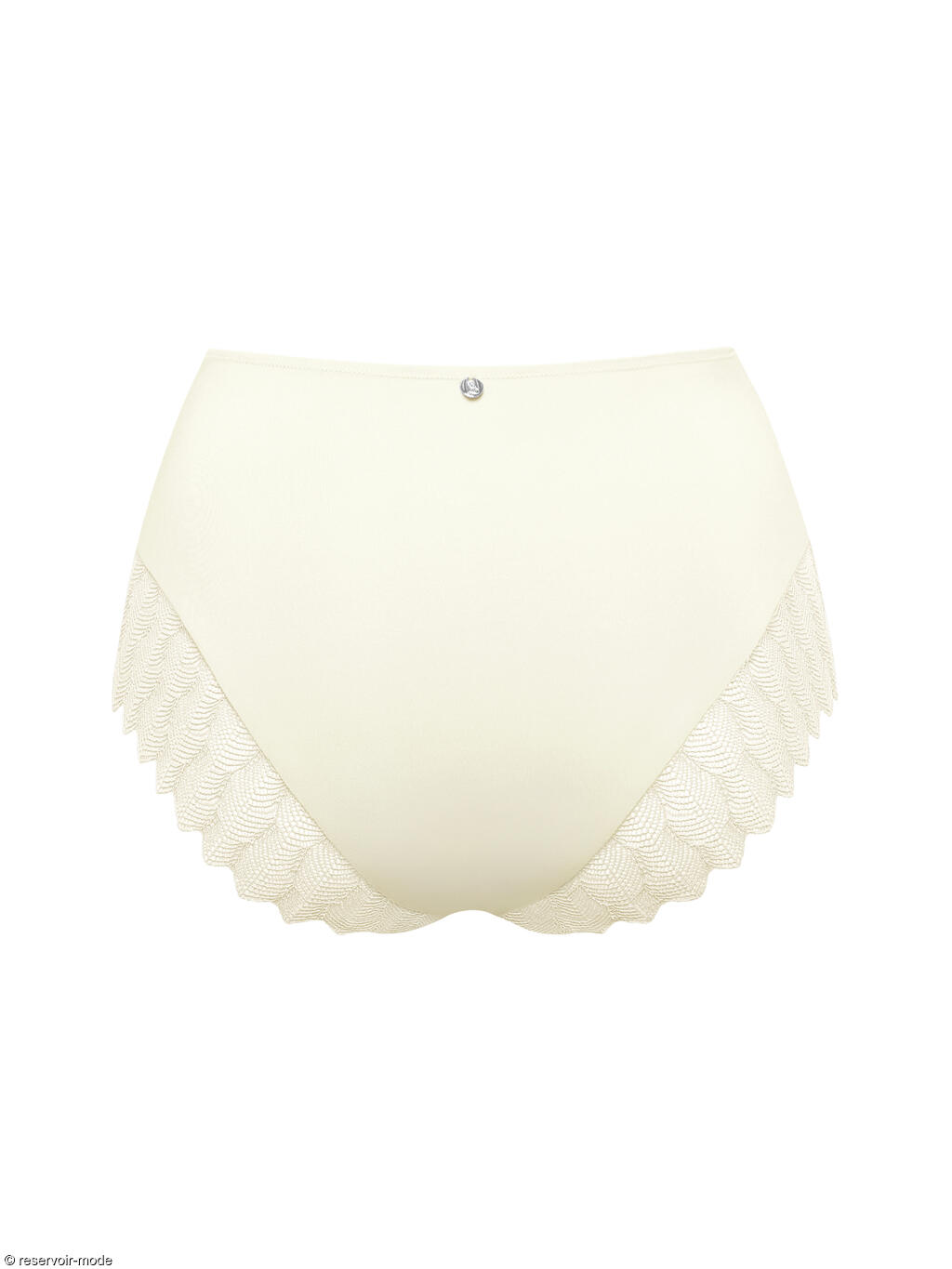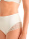 Slip confortable à taille haute, qui couvre la majeure partie du ventre pour un maintien en douceur. Le devant et le dos sont séduisants, dans une dentelle associée à un tricot élastique à l'aspect satiné. Ouvertures pour les jambes bordées de dentelle, sans élastique. Gousset en coton pour un confort intime garanti.