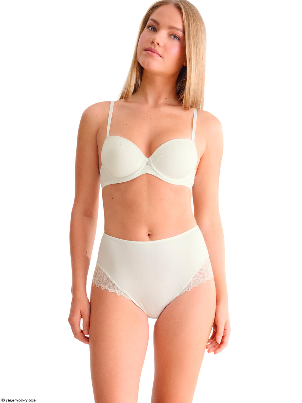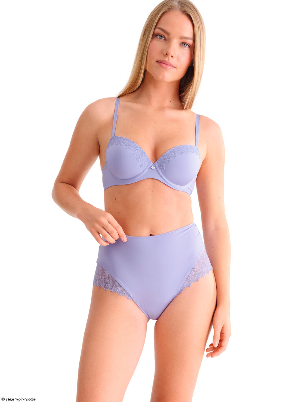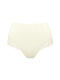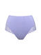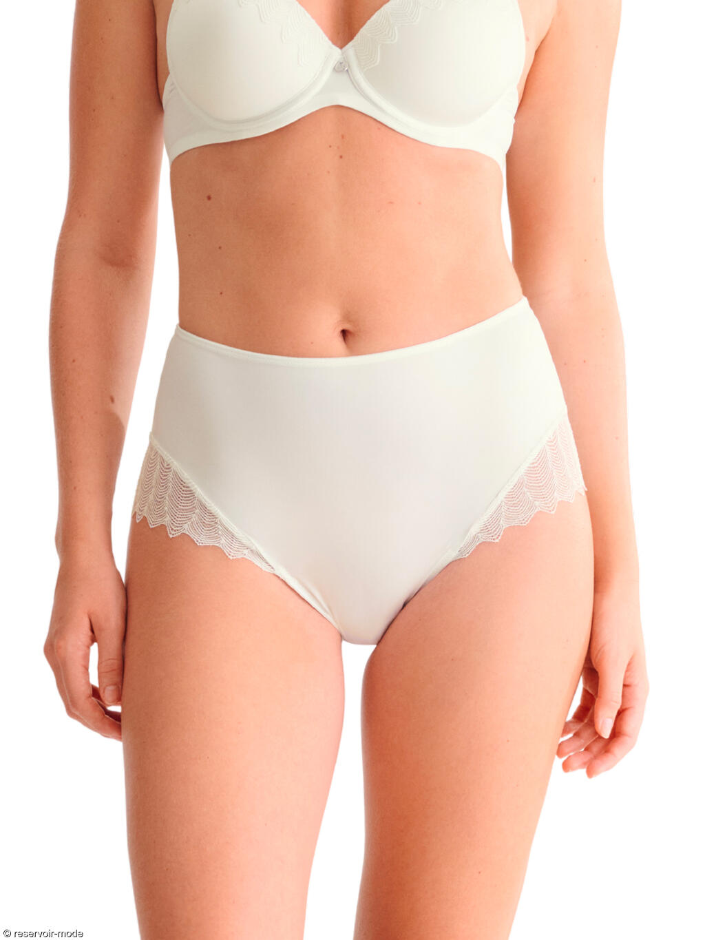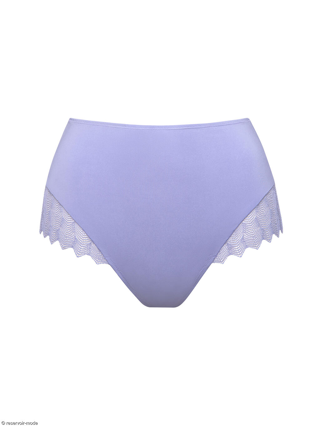 Slip confortable à taille haute, qui couvre la majeure partie du ventre pour un maintien en douceur. Le devant et le dos sont séduisants, dans une dentelle associée à un tricot élastique à l'aspect satiné. Ouvertures pour les jambes bordées de dentelle, sans élastique. Gousset en coton pour un confort intime garanti.