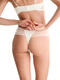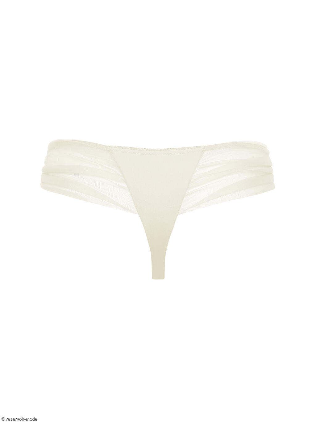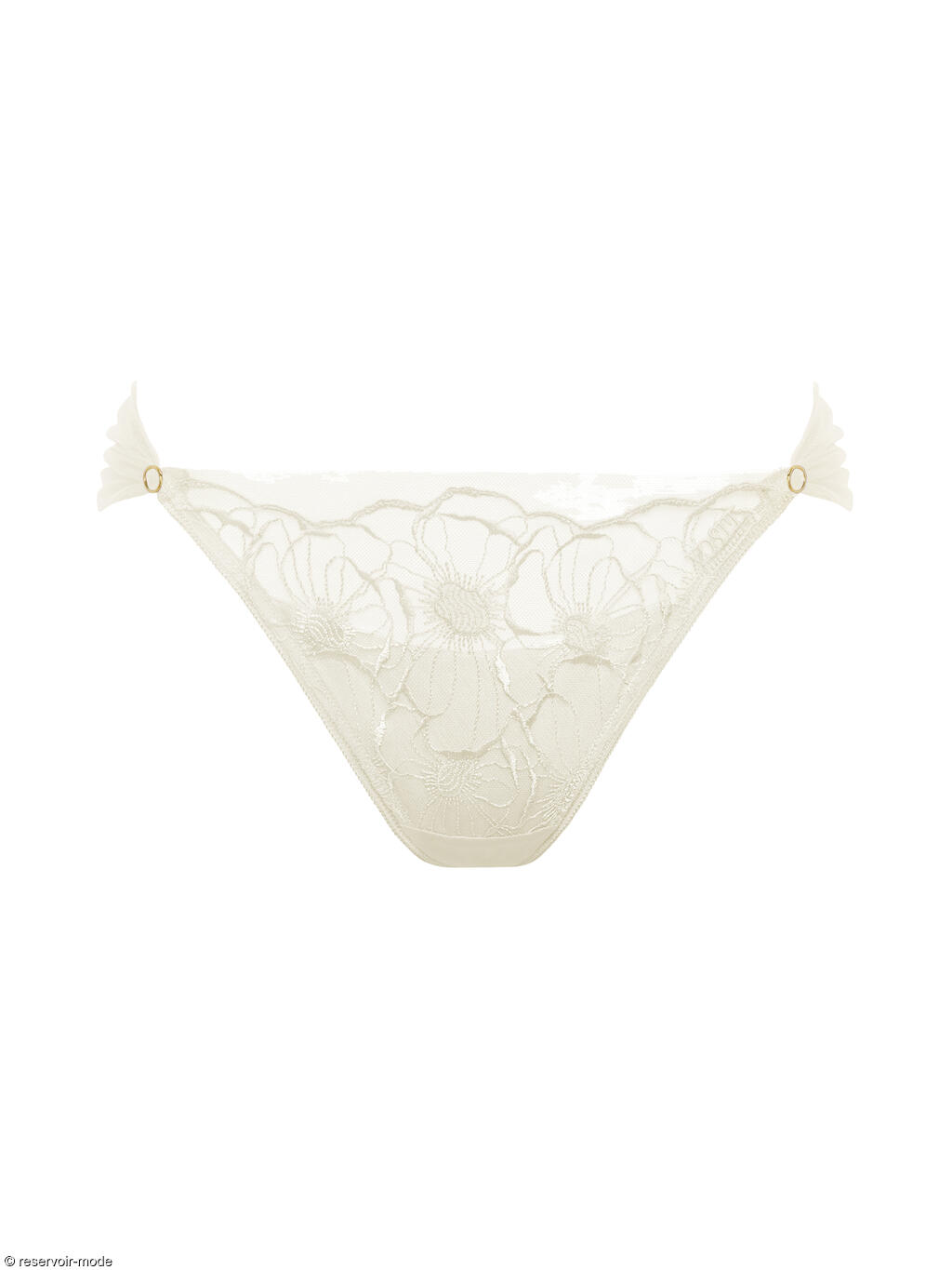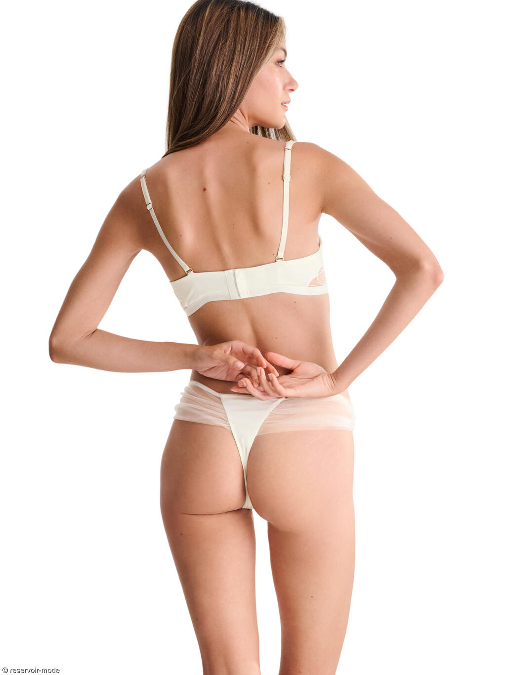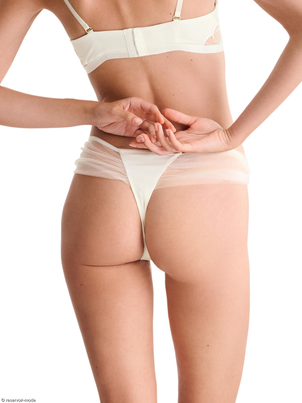 String collection MIRACLE MARIAGE de la marque Lisca.  Coupe minimaliste avec un devant brodé, partiellement rembourré. Le devant en tulle se prolonge en un drapé [voir la suite]
