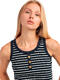 Ce débardeur en coton présente un style marin à rayures horizontales bleu marine et blanches. Il est confectionné dans une maille côtelée, ce qui lui donne un aspect légèrement texturé et une coupe ajustée qui épouse la silhouette. Le modèle est sans manches, avec des emmanchures larges et un col rond souligné par un liseré bleu marine. Sur le devant, on trouve une patte de boutonnage courte ornée de trois boutons décoratifs dorés, qui ajoutent une touche élégante et féminine. C’est un débardeur à la fois simple, confortable et chic, facile à porter au quotidien, notamment en été.