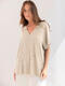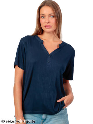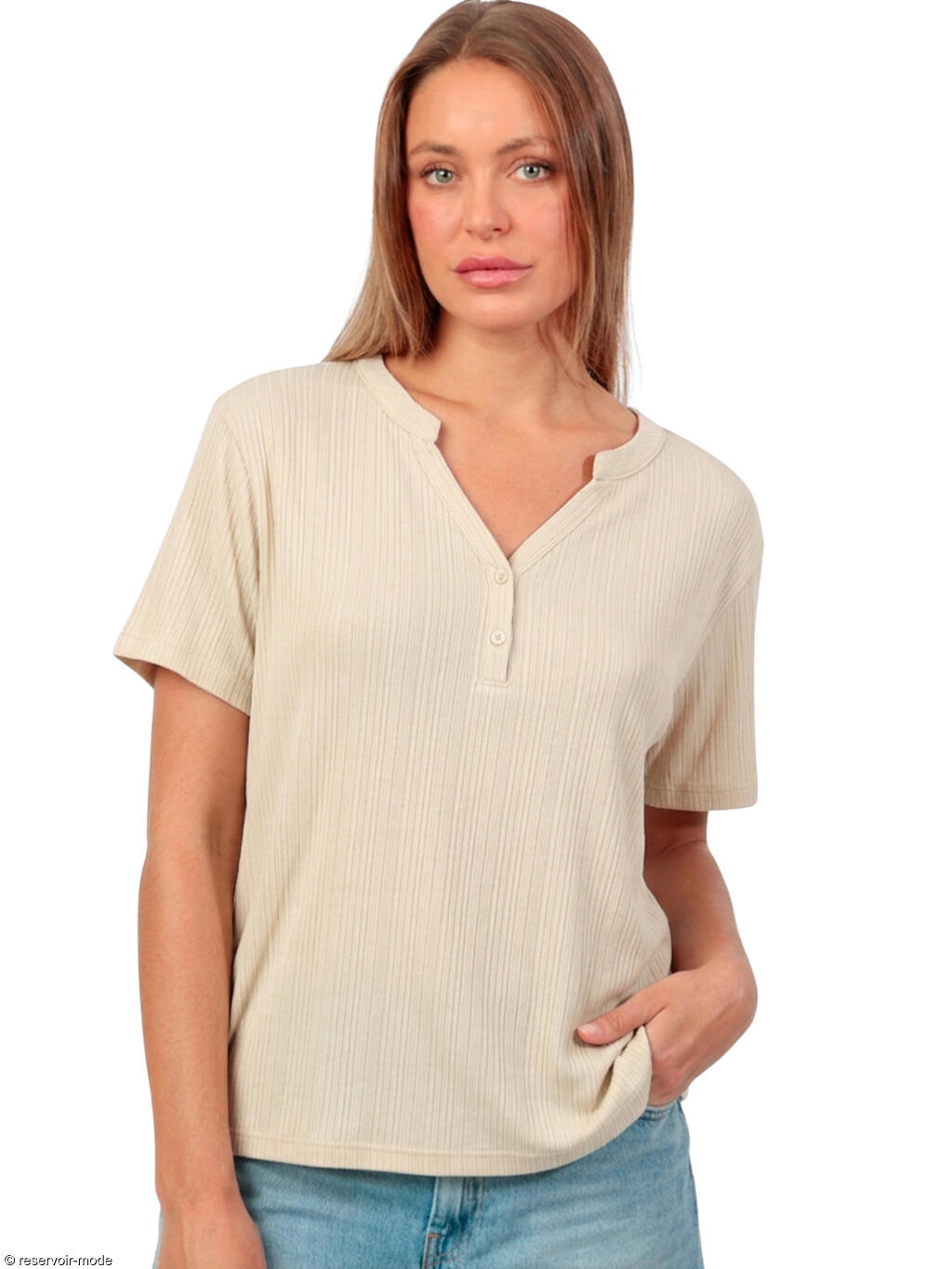 Ce t-shirt séduit par son élégance discrète et son confort naturel. Sa matière viscose fluide, légère et douce au toucher épouse délicatement les mouvements du corps tout en offrant une belle tenue. Le design met en avant une encolure originale, légèrement arrondie avec une petite fente en V, prolongée par une patte de boutonnage fine à trois boutons ton sur ton. Ce détail apporte une note féminine et subtilement sophistiquée. Le tissu présente un léger motif en fines rayures verticales, tissé directement dans la matière, ce qui crée un jeu de texture élégant. Les manches courtes, droites et souples, ainsi que la coupe ample et fluide, assurent une silhouette décontractée mais soignée. C’est un t-shirt à l’esprit casual chic, idéal pour une tenue quotidienne élégante, confortable et raffinée.