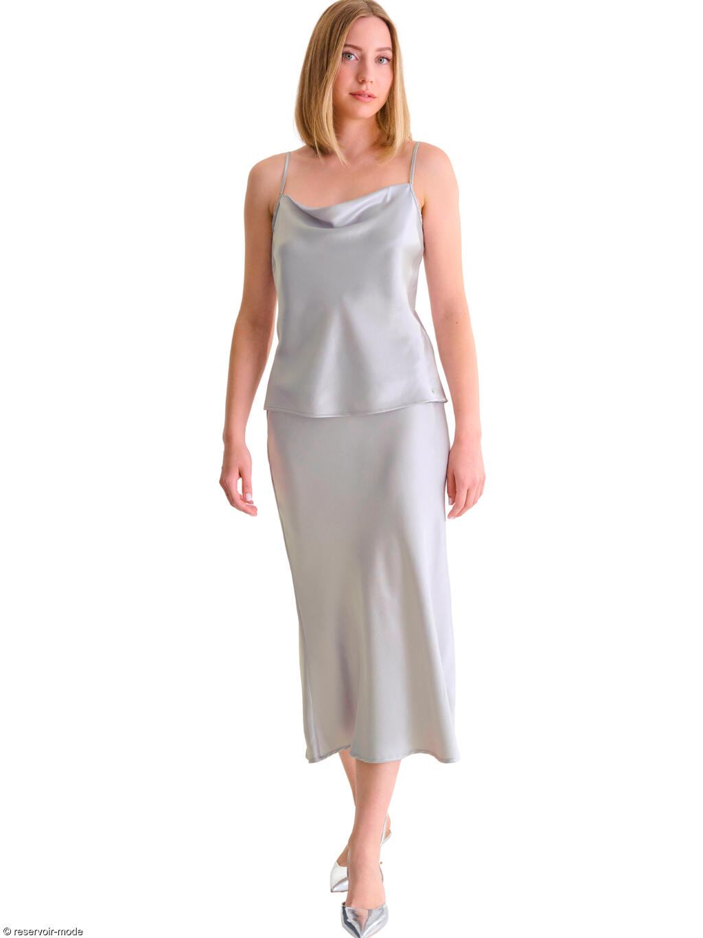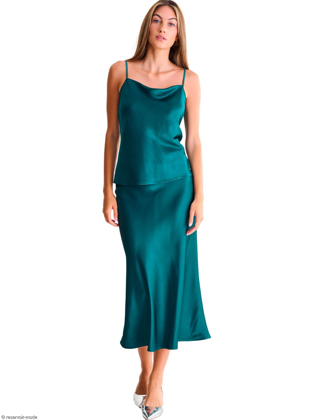 Top à fines bretelles spaghetti doté d'un col bénitier souple, dont les drapés gracieux épousent le décolleté sans le contraindre. Sa texture lisse et soyeuse glisse sur la peau, offrant une sensation de légèreté et de fraîcheur. Sa coupe légèrement droite mais fluide souligne la silhouette sans la mouler, pour un tombé naturel et raffiné. La matière en viscose et polyester recyclé incarne une élégance subtile et contemporaine. Une étoffe satinée lumineuse qui capte la lumière avec délicatesse. La promesse d'une allure moderne, féminine et sophistiquée, qui vous offrira une tenue idéale pour une soirée, un cocktail ou un événement élégant.