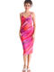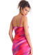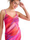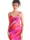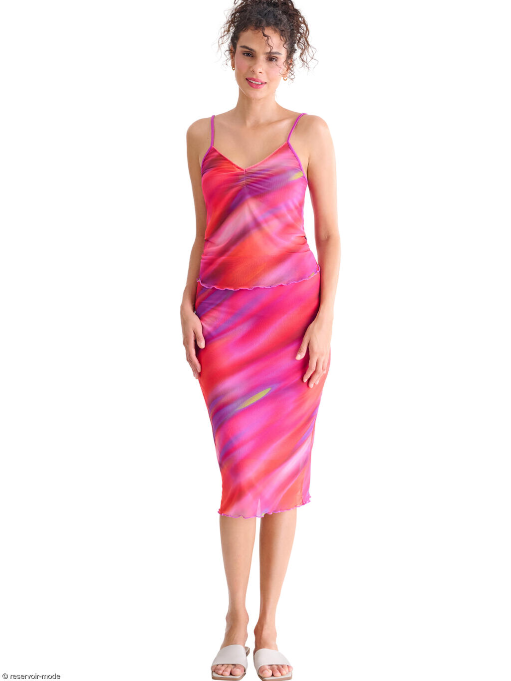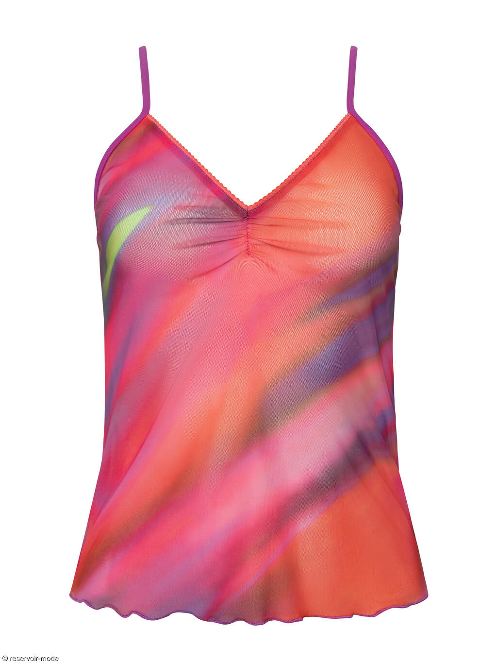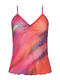 Débardeur à fines bretelles spaghetti, au décolleté en V légerement froncé au centre, qui met subtilement en valeur la poitrine. Il épouse délicatement la silhouette sans être trop ajusté, offrant un tombé fluide et naturel. Le tissu est un voile extensible et fin, qui épouse le mouvement du corps. L’imprimé est spectaculaire : un motif abstrait aux nuances vibrantes, créant un effet de dégradé fluide et irisé, presque comme une peinture aquarelle en mouvement. Les couleurs intenses et lumineuses évoquent la chaleur d’un coucher de soleil d’été ou l’énergie d’une soirée tropicale. Il s'en dégage une ambiance estivale, féminine et dynamique, parfait à porter pour une garden-party, un apéritif en bord de mer ou une escapade estivale.