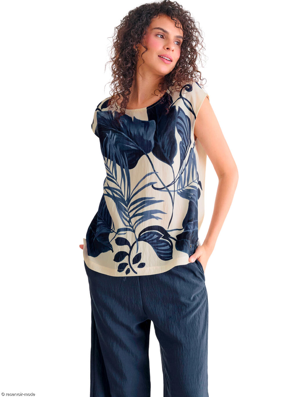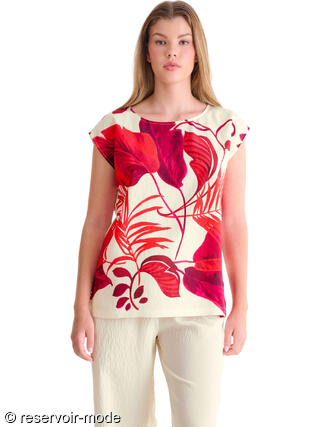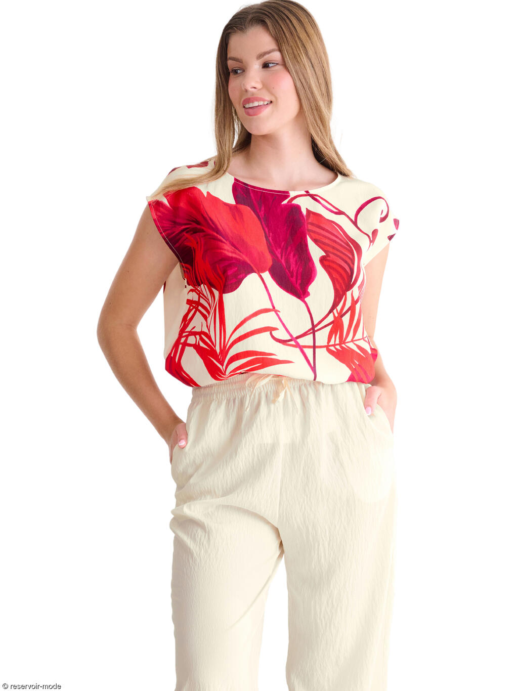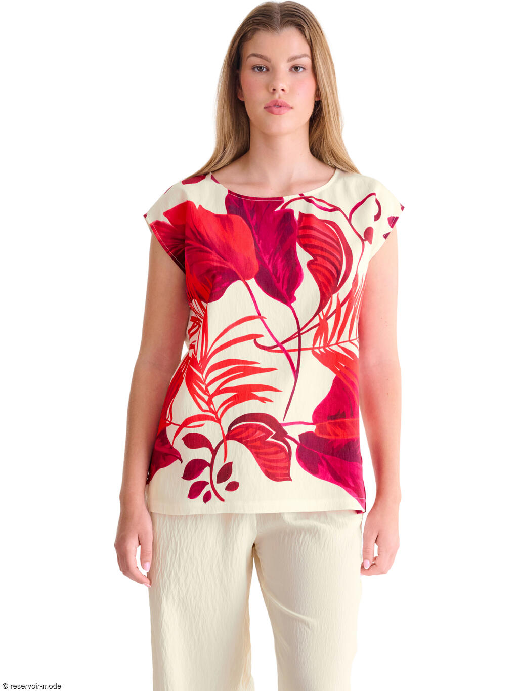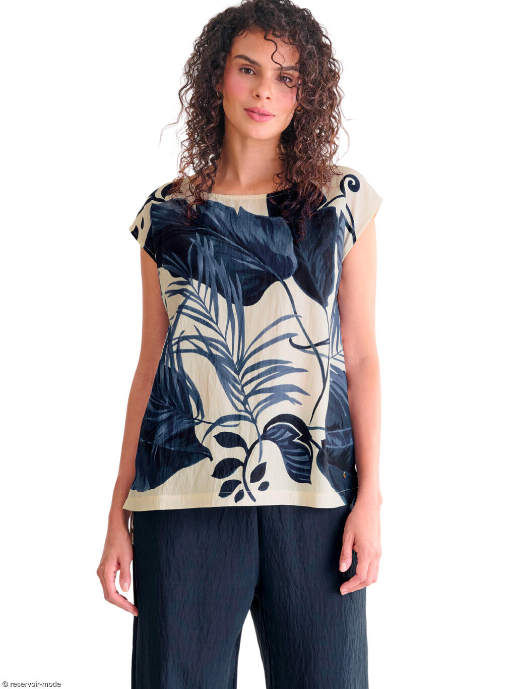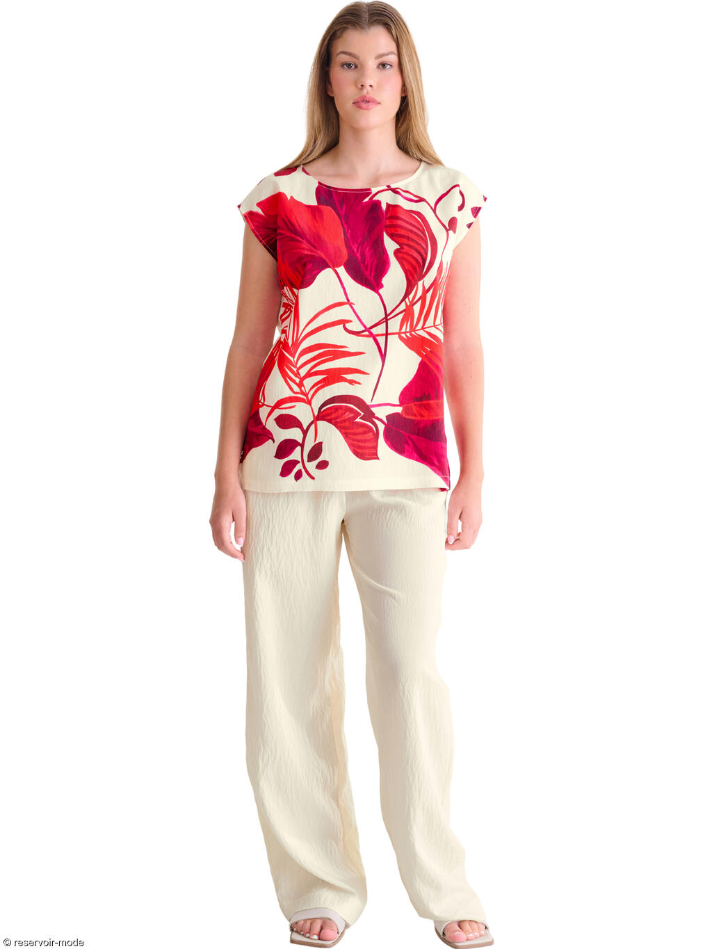 Ce top féminin et estival se distingue par sa coupe droite et fluide, offrant une silhouette à la fois élégante et décontractée. Il est confectionné dans un tissu viscose léger de couleur écrue, au toucher légèrement texturé, qui met parfaitement en valeur le grand imprimé botanique qui le recouvre. Le motif, très expressif, évoque une végétation tropicale luxuriante : de grandes feuilles et fleurs stylisées s’entrelacent dans une palette vibrante. Ces nuances contrastent magnifiquement avec le fond clair, apportant énergie et caractère à la pièce. Le col rond, simple et dégagé, souligne la ligne du cou tandis que les manches courtes et légèrement tombantes ajoutent une touche de douceur et de féminité. La longueur du top qui s’arrête juste sur les hanches, environ 65 cm, en fait un vêtement facile à porter aussi bien rentré dans un pantalon ou une jupe que laissé libre pour un style plus naturel. C’est un haut à l’allure fraîche et solaire, parfait pour les journées d’été ou pour apporter une note colorée à une tenue plus sobre.