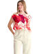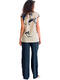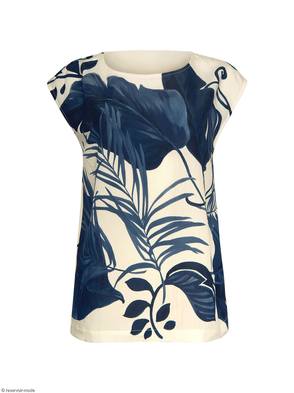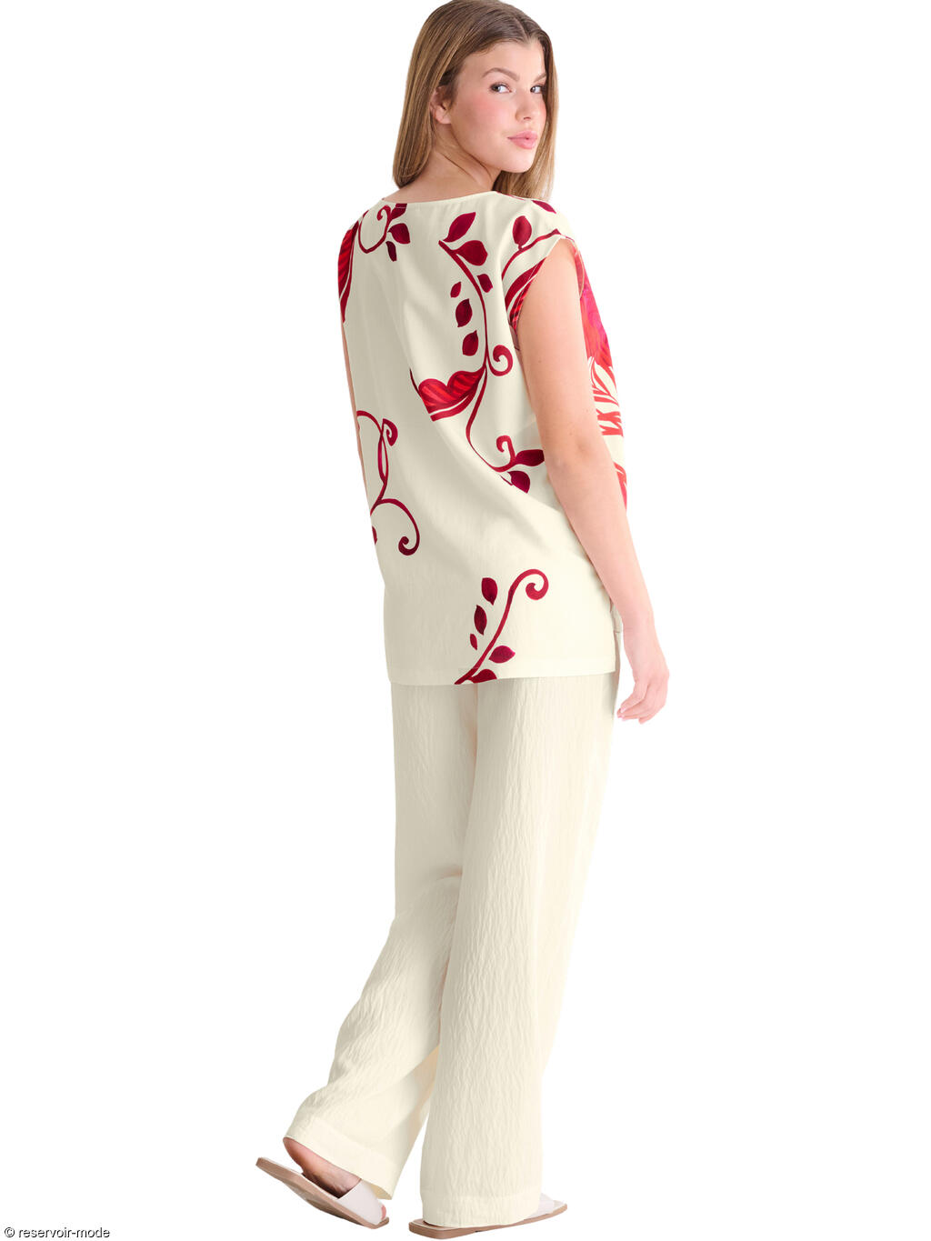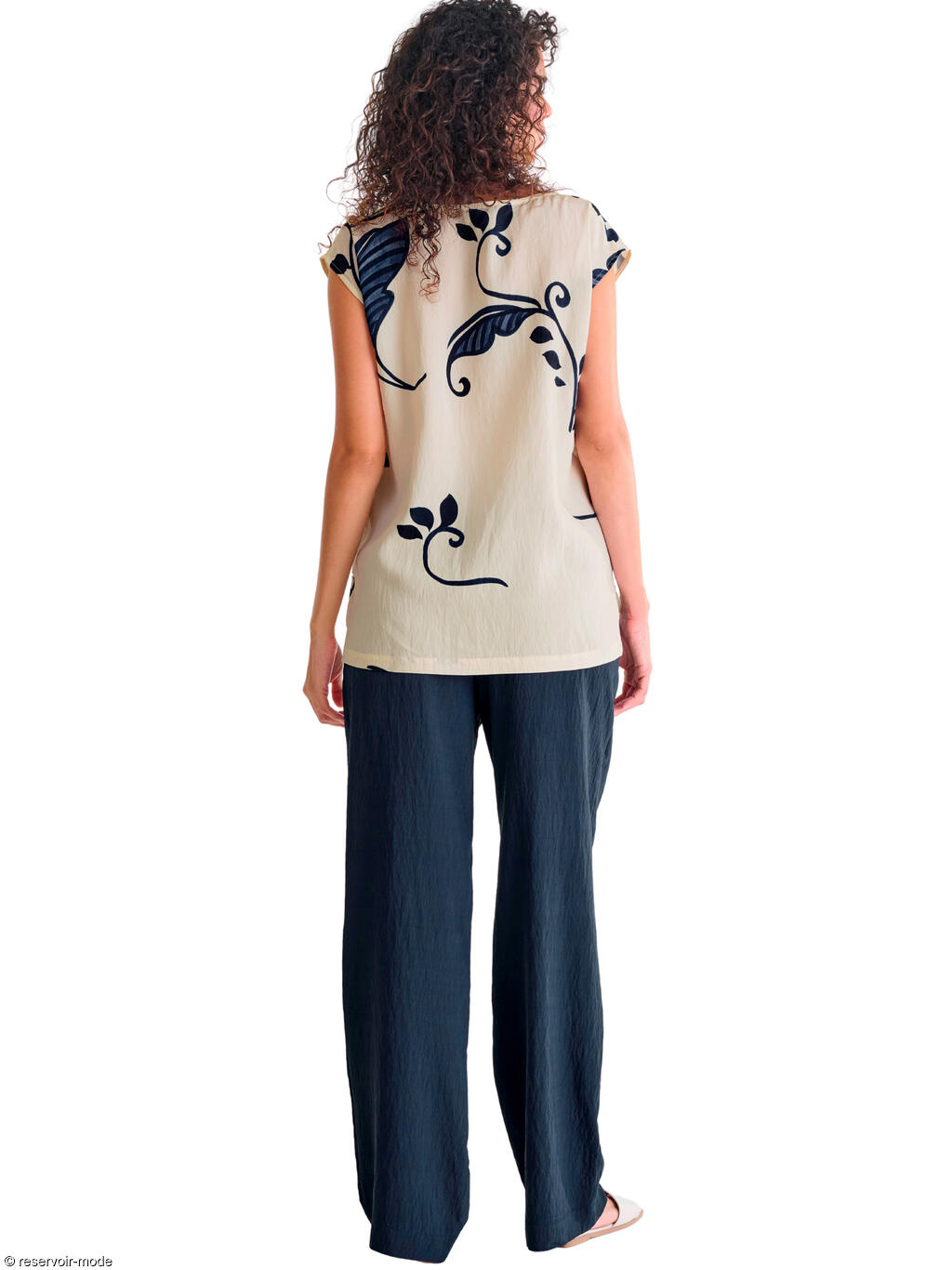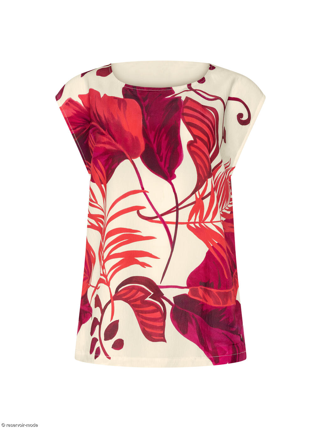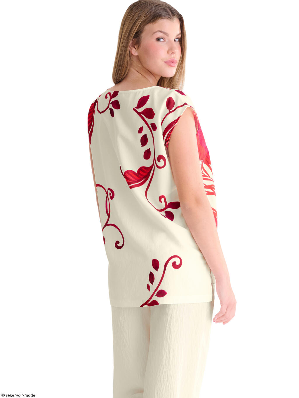Ce top féminin et estival se distingue par sa coupe droite et fluide, offrant une silhouette à la fois élégante et décontractée. Il est confectionné dans un tissu viscose léger de couleur écrue, au toucher légèrement texturé, qui met parfaitement en valeur le grand imprimé botanique qui le recouvre. Le motif, très expressif, évoque une végétation tropicale luxuriante : de grandes feuilles et fleurs stylisées s’entrelacent dans une palette vibrante. Ces nuances contrastent magnifiquement avec le fond clair, apportant énergie et caractère à la pièce. Le col rond, simple et dégagé, souligne la ligne du cou tandis que les manches courtes et légèrement tombantes ajoutent une touche de douceur et de féminité. La longueur du top qui s’arrête juste sur les hanches, environ 65 cm, en fait un vêtement facile à porter aussi bien rentré dans un pantalon ou une jupe que laissé libre pour un style plus naturel. C’est un haut à l’allure fraîche et solaire, parfait pour les journées d’été ou pour apporter une note colorée à une tenue plus sobre.