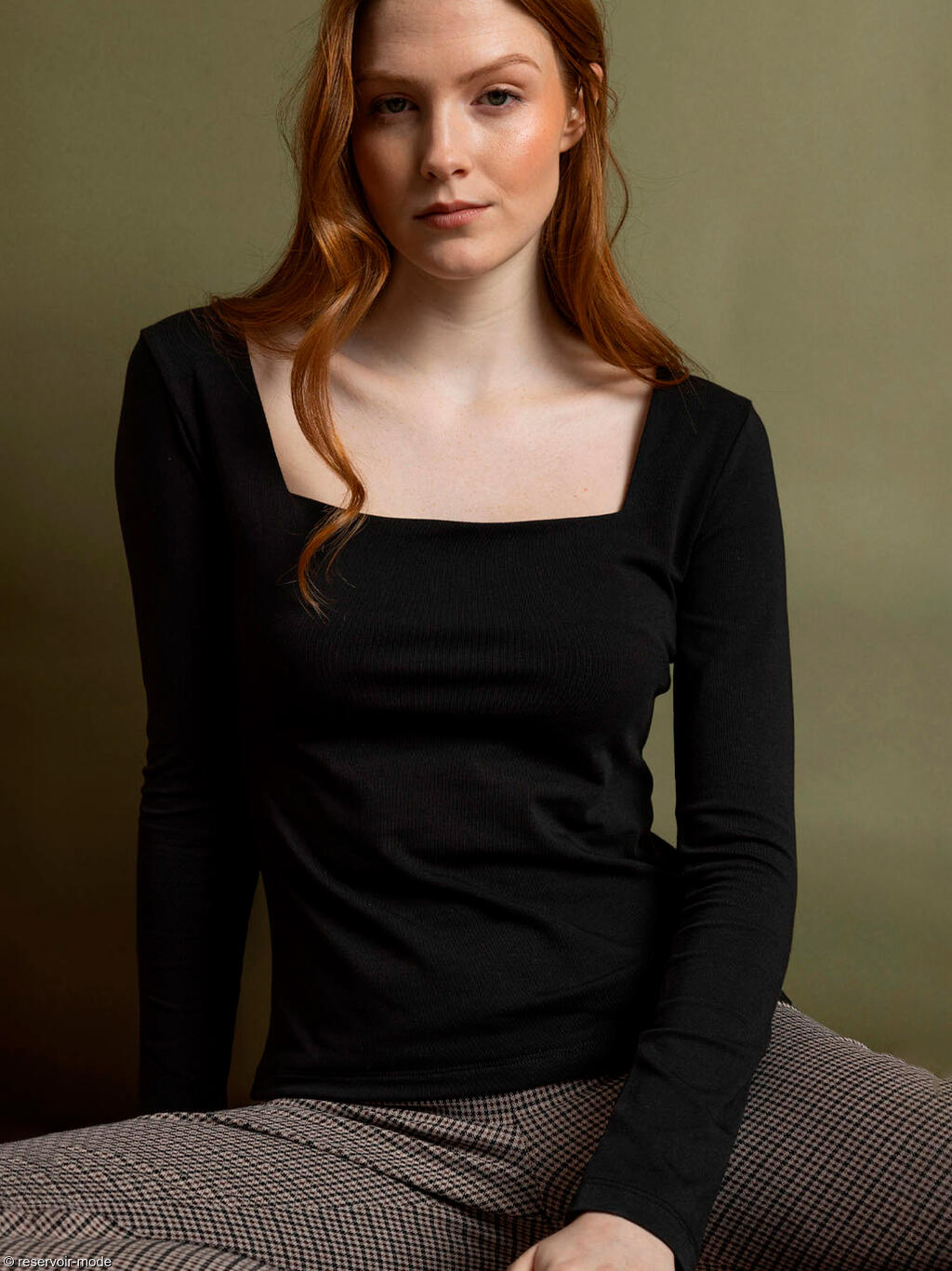 Haut à manches longues noir, un classique revisité qui allie finesse et modernité. Sa coupe épouse délicatement la silhouette tandis que son encolure carrée apporte une touche d'audace et de raffinement, mettant en valeur votre port de tête avec élégance. Conçu dans un tissu doux et finement côtelé, il offre un confort absolu tout au long de la journée, tout en restant impeccablement chic. Facile à associer, il est parfait pour créer une multitude de looks : décontracté avec un jean, professionnel avec un pantalon tailleur à carreaux, ou sophistiqué sous une veste. Une pièce intemporelle qui vous charmera et s'associera à toute votre garde-robe.