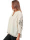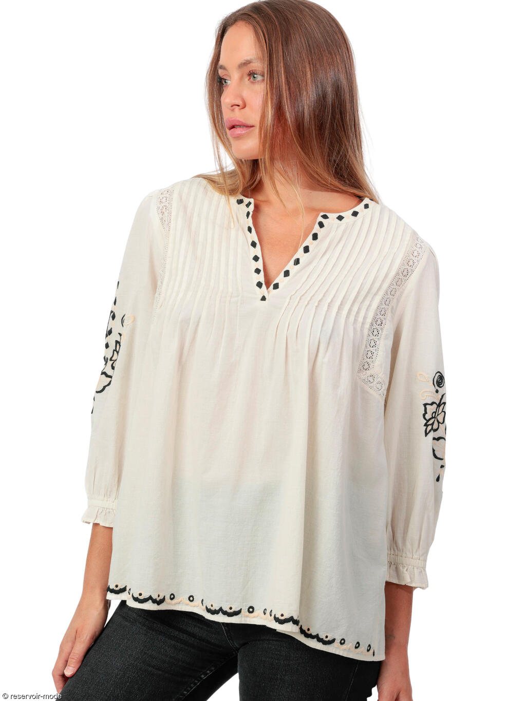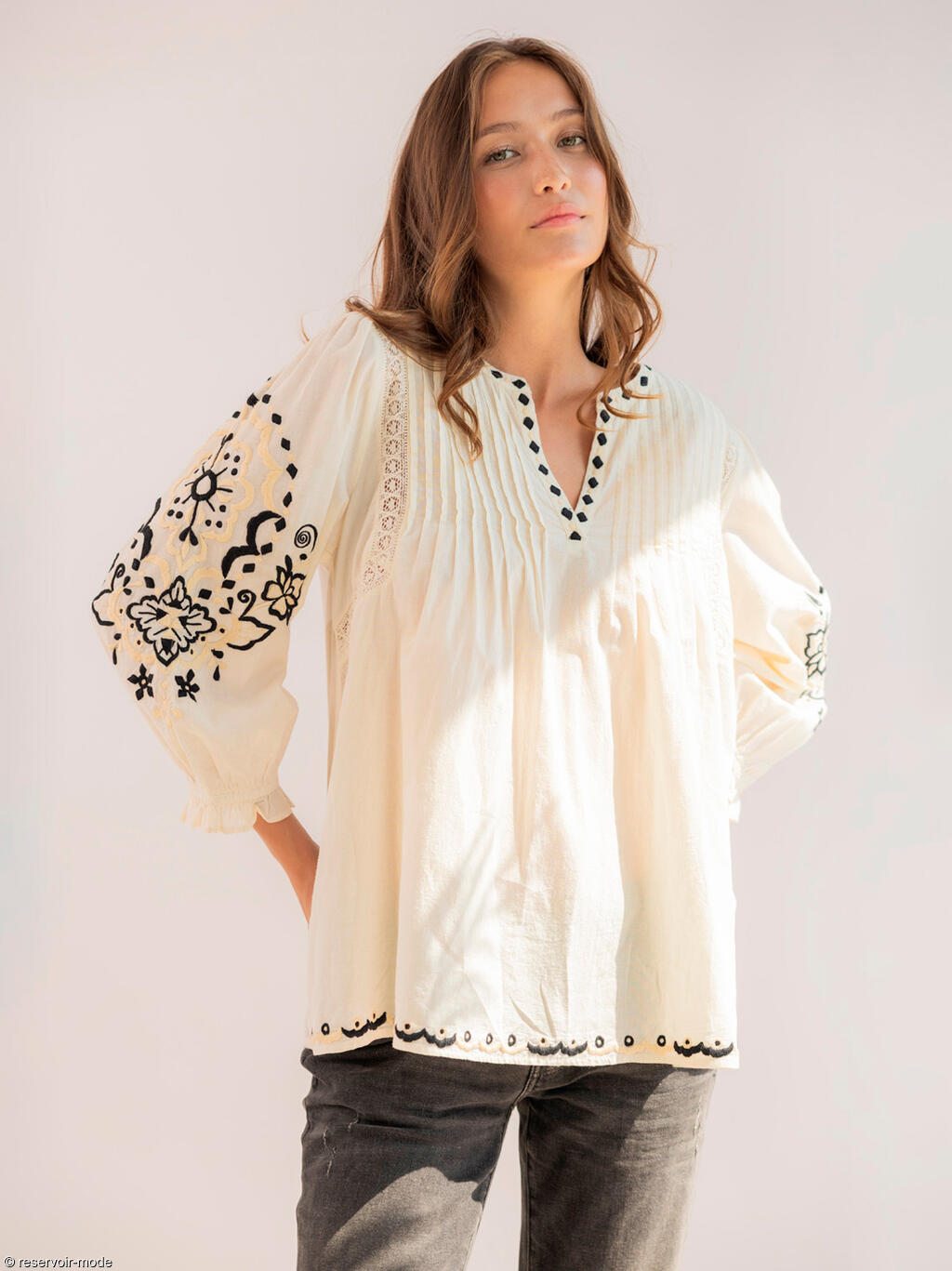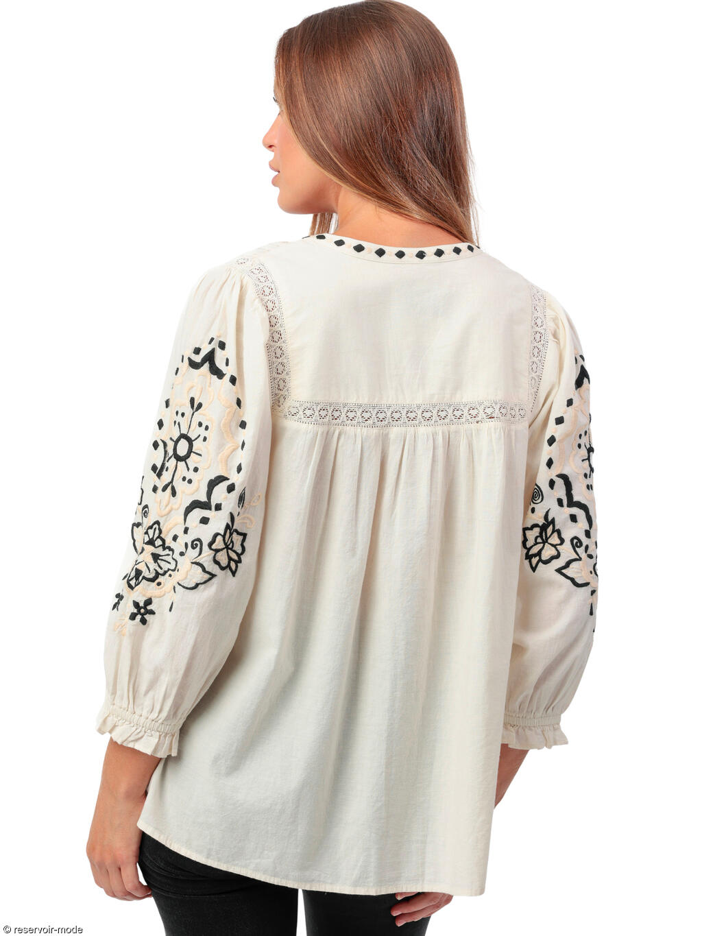 Ce haut vous offrira un style bohème chic très raffiné. De couleur écru, il se distingue par sa coupe ample et fluide, qui lui confère une allure légère et décontractée tout en restant féminine. Le col tunisien légèrement ouvert est bordé d’une broderie géométrique noire, apportant une touche contrastée et artisanale. Le haut du buste est orné de plis nervurés verticaux et de bandes de dentelle délicate sur les épaules, ce qui structure subtilement la silhouette. Les manches trois-quarts se terminent par un poignet élastiqué froncé, accentuant le volume souple du tissu. On retrouve également de jolies broderies florales noires sur les manches et le bas du vêtement, agrémentées de détails ajourés et de motifs festonnés pour une finition soignée. Ce t-shirt marie confort et élégance naturelle. Parfait avec un jean brut ou un pantalon fluide, il incarne un esprit authentique, romantique et intemporel, idéal pour un look à la fois casual et raffiné.