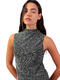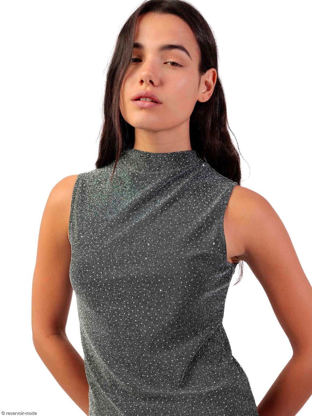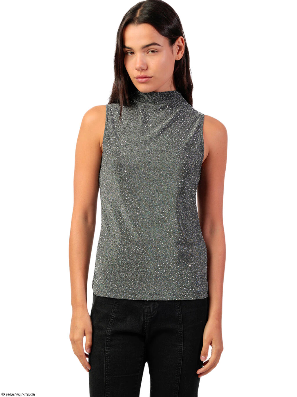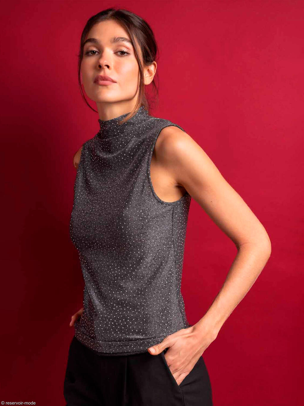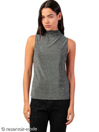 Top sans manches col montant Gemstones de la marque Admas. Ce top sans manches affiche une allure chic et moderne grâce à son tissu scintillant. Il offre une texture fluide, [voir la suite]