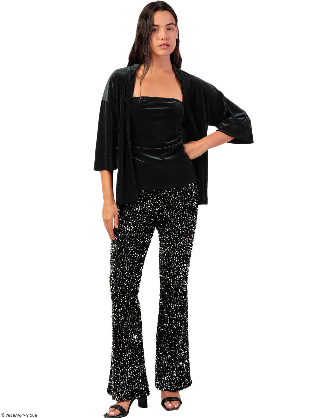 Veste en velours qui se distingue par son élégance sobre et moderne. Conçue dans un velours noir profond, elle capte légèrement la lumière, créant un jeu subtil de reflets qui souligne la richesse du tissu. La matière est souple, douce et fluide, ce qui permet au vêtement de tomber naturellement autour du corps. Sa coupe oversize et ouverte lui donne une allure décontractée mais raffinée. Elle ne comporte ni boutons ni fermeture, ce qui renforce son style épuré. Les manches 3/4, larges et légèrement évasées, ajoutent une touche contemporaine, tandis que les revers cousus au niveau des manches apportent une finition soignée. La veste descend jusqu’aux hanches, créant une silhouette harmonieuse et facile à associer, que ce soit sur un haut ajusté ou sur une tenue plus structurée. Son style minimaliste met vraiment en avant la texture luxueuse du velours, et en fait une pièce idéale pour une tenue habillée de soirée, tout en restant confortable. Livrée dans une boîte-coffret Admas, idéale à offrir en cadeau.