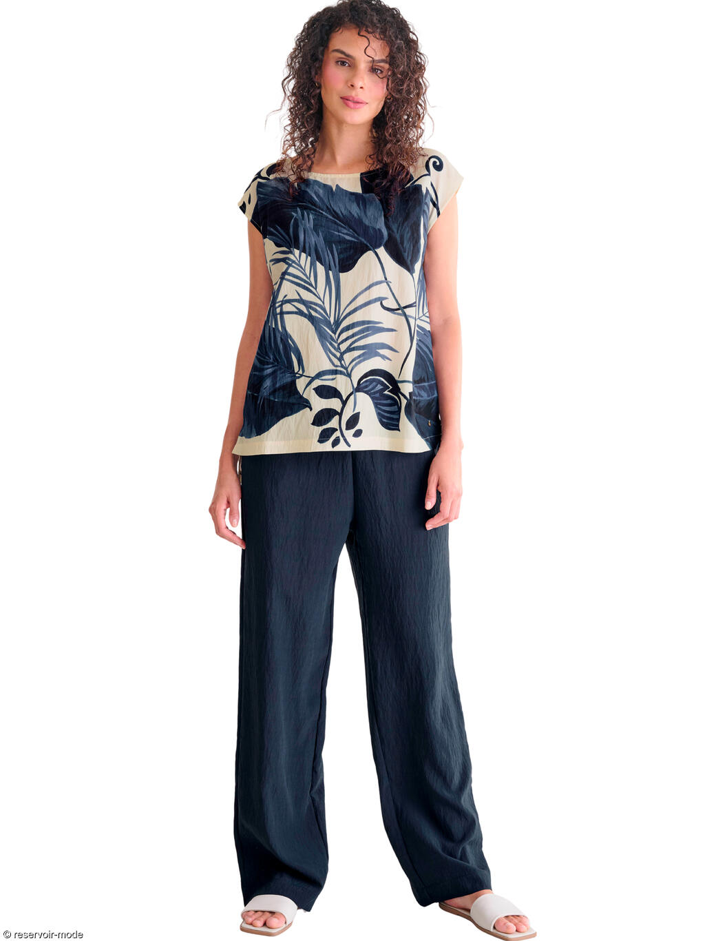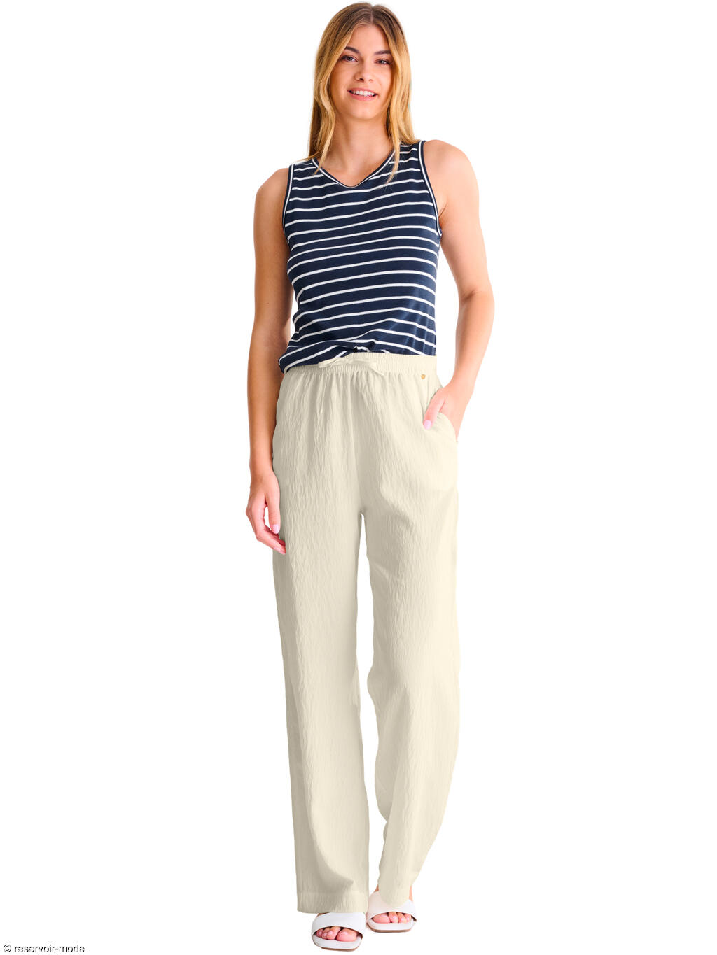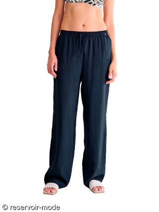Ce pantalon estival présente une coupe ample et fluide, offrant un tombé naturellement droit qui allonge la silhouette. Il est confectionné dans un tissu viscose léger à texture gaufrée, légèrement froissée, donnant un effet décontracté mais soigné, idéal par temps chaud. La taille élastiquée est accompagnée d’un cordon discret permettant un ajustement confortable, sans compromettre l’esthétique minimaliste du vêtement. Il est doté de poches latérales pratiques. Sa teinte intemporelle apporte une touche élégante, facile à assortir avec des tons clairs ou neutres. Il s’associera bien à tous les hauts d'été de votre garde-robe pour un style relax, raffiné et très estival, ou il pourra être enfilé sur votre maillot de bain à la sortie de l'eau pour un look stylé au bar de la piscine ou de la plage.