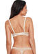 Soutien-gorge dans un style bralette à la mode, spéciale pour les décolletés profonds, à la fois sensuel et structurant. Ses bonnets armaturés et semi-préformés offrent un bon maintien tout en mettant en valeur le décolleté. Il recentre la poitrine et a un effet de poussée sans artifices. La dentelle délicate apporte légèreté et féminité. Elle présente un motif floral finement dessiné, composé de petites fleurs stylisées reliées par des lignes souples, et épouse les formes avec subtilité. Le bord festonné le long des bonnets et dans le dos renforce le charme féminin du soutien-gorge. Cette finition ondulée ajoute une touche de finesse supplémentaire, tout en restant confortable au contact de la peau. Les fines bretelles et la fermeture par agrafes dans le dos sont réglables pour un ajustement parfait. Un crochet dans le dos permet de croiser les bretelles. A l'avant, les bretelles sont ornées d'un délicat bijou doré très fin, ainsi qu'entre les bonnets sur deux liens subtils. Petit logo doré sur le côté, boucle plate.