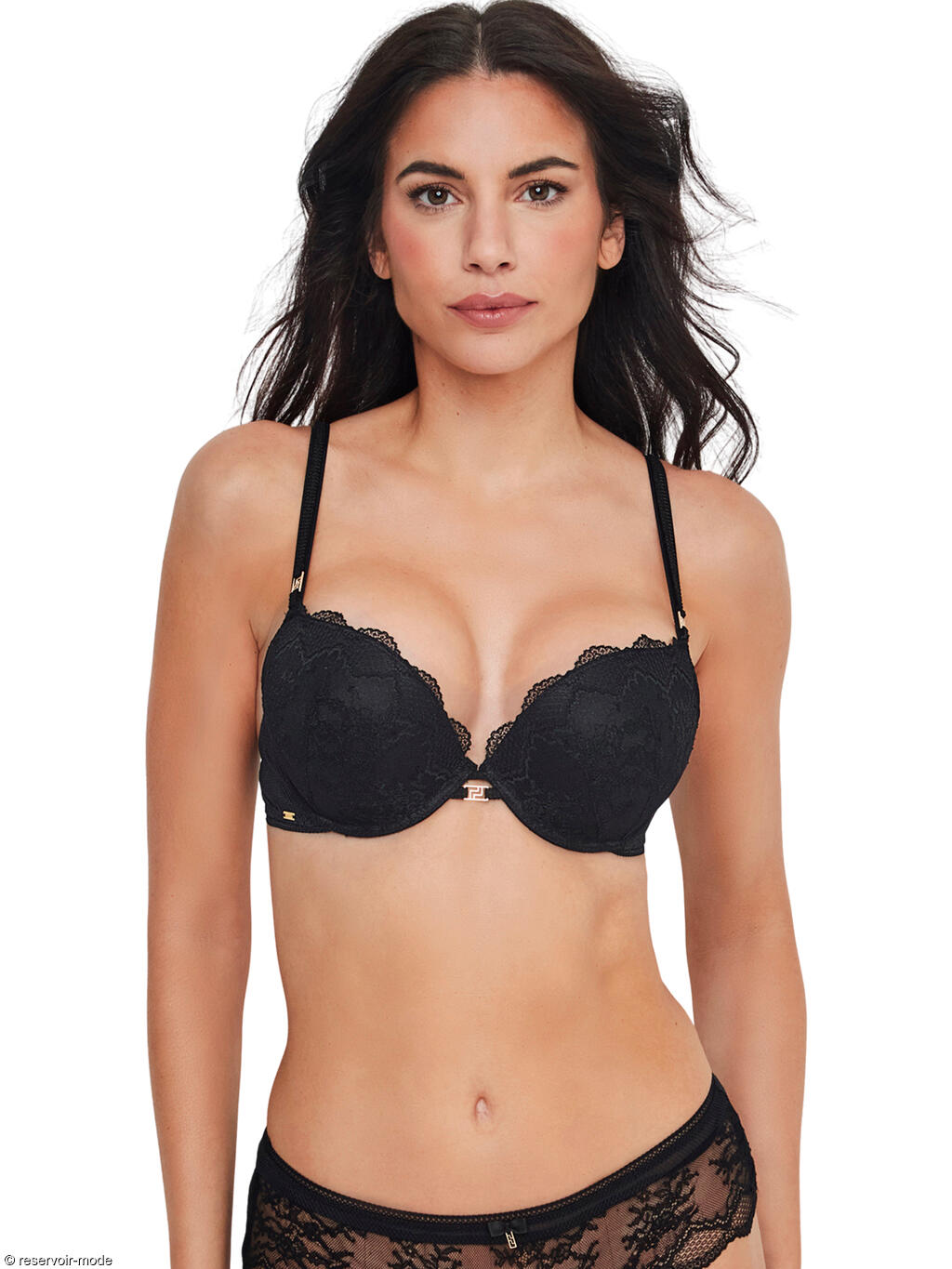 Soutien-gorge armaturé double push-up, avec une double mousse dans le bonnet qui réhausse et augmente la poitrine de deux tailles. Une dentelle délicate sur les bonnets apporte légèreté et féminité. Elle présente un motif floral finement dessiné, composé de petites fleurs stylisées reliées par des lignes souples, et épouse les formes avec subtilité. Le bord festonné le long du décolleté renforce le charme féminin du soutien-gorge. Cette finition ondulée ajoute une touche de finesse supplémentaire, tout en restant confortable au contact de la peau. Les fines bretelles et la fermeture par agrafes dans le dos sont réglables pour un ajustement parfait. Un crochet dans le dos permet de croiser les bretelles. A l'avant, les bretelles sont ornées d'un délicat bijou doré très fin, ainsi qu'entre les bonnets sur deux liens subtils. Petit logo doré sur le côté, boucle plate.