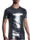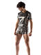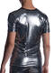 Modèle très moderne et audacieux, offrant une coupe ajustée près du corps. Il possède des manches courtes et une encolure arrondie soulignée par un liseré noir uni, qui contraste subtilement avec la texture brillante du reste du vêtement. Le point fort de cette collection Nightclub est son magnifique tissu microfibre scintillant. Il est imprimé de petits triangles argentés sur toute sa surface, comme une boule disco. Avec ce t-shirt éclatant, vous serez le centre d'attention de toutes les fêtes !