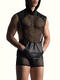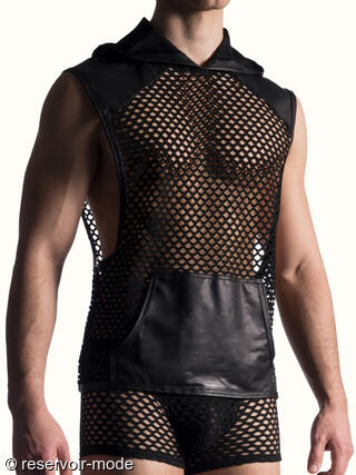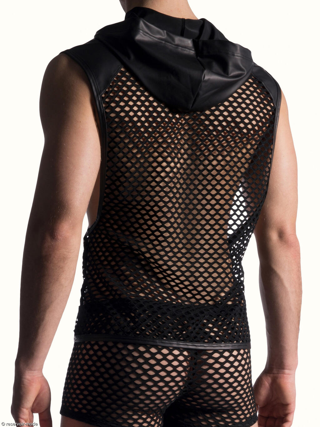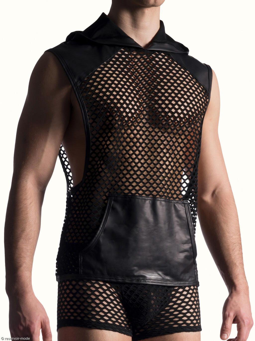 T-shirt sans manches à capuche, qui adopte un style audacieux et très contemporain. Il se distingue par sa coupe ajustée et échancrée, avec de larges ouvertures sur les côtés qui dégagent les flancs et accentuent la carrure. Confectionné dans un tissu élastique perforé, sa maille très large est extensible et crée un effet transparent en motif quadrillé. La capuche intégrée donne une touche sportive et urbaine. Une grande poche kangourou à l’avant contraste avec la texture ajourée. Les poches sur le ventre, les parties sur les épaules et la capuche sont en Wetlook. Une combinaison de matières pour un rendu à la fois graphique et texturé. L’ensemble évoque un look hybride entre streetwear, clubwear et esthétique alternative, avec un fort impact visuel grâce au jeu de transparence et de brillance.