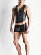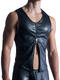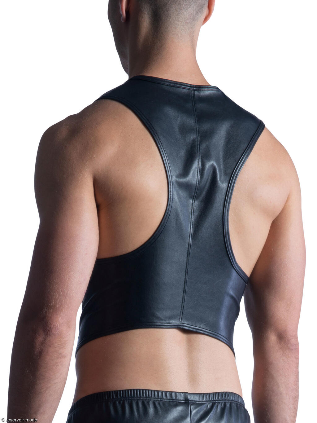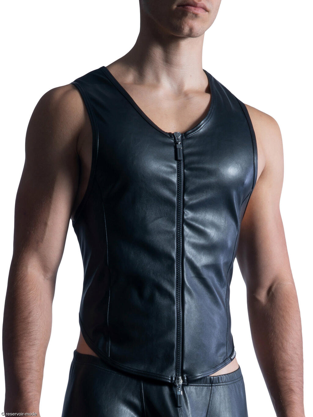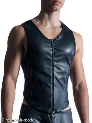 Veste sans manches très sexy en microfibre extensible et super douce, dans un style moderne et audacieux. Confectionnée dans une matière noire lisse et légèrement brillante imitant le cuir, la coupe est ajustée et près du corps, mettant en valeur la silhouette. Ce veston possède une fermeture éclair centrale sur toute la longueur à l’avant. L’encolure est arrondie et dégagée, sans col, ce qui renforce son esthétique épurée. Les emmanchures sont larges, laissant les épaules et les bras entièrement découverts. Il se distingue par son dos nageur plus court à l’arrière, créant un effet dynamique et soulignant la ligne du dos. L’ensemble donne une impression à la fois sportive et sophistiquée, avec une touche contemporaine et affirmée. C'est du pur luxe. Une imitation nappa traitée au laser, douce et sensible comme le cuir le plus fin pour gants. Confort optimal sur la peau et aussi facile à entretenir qu'un t-shirt en coton.